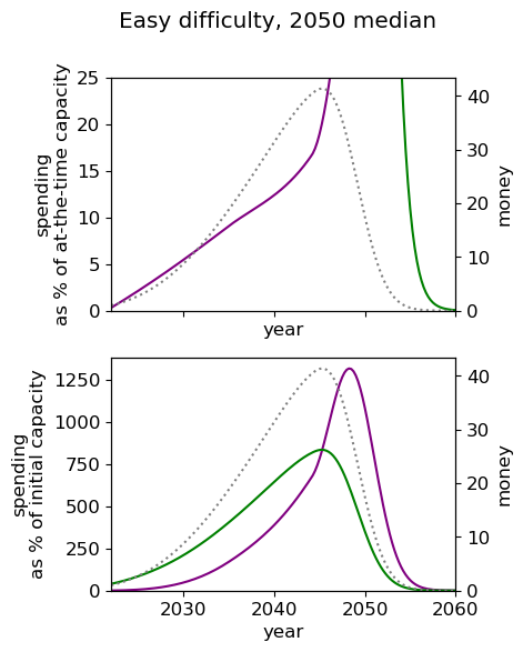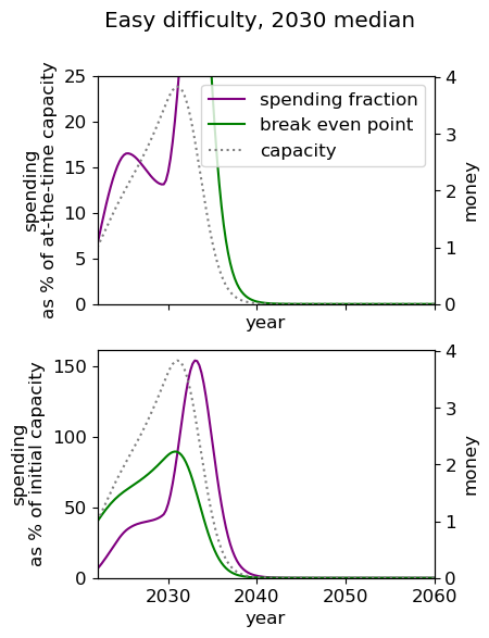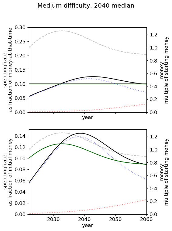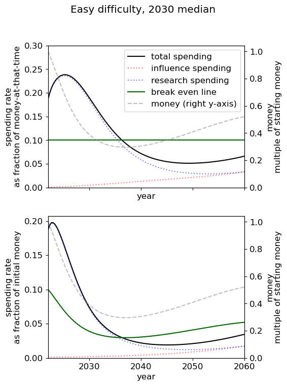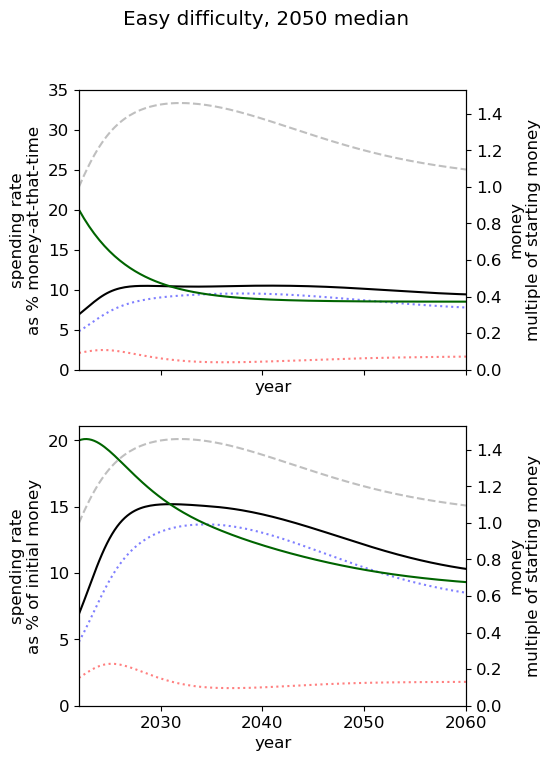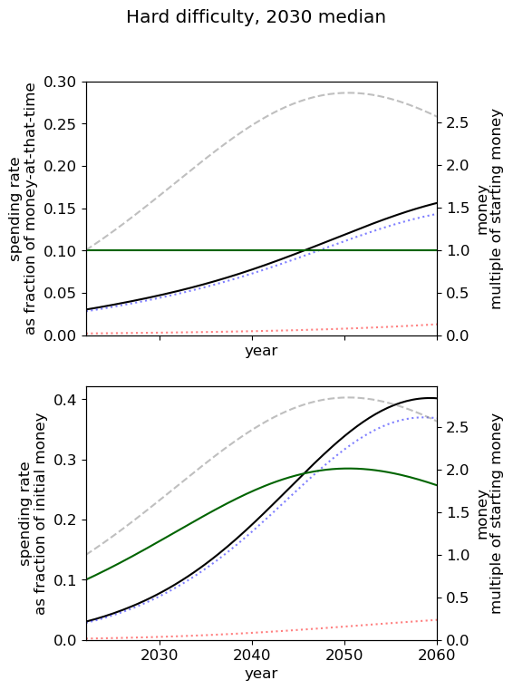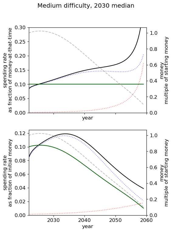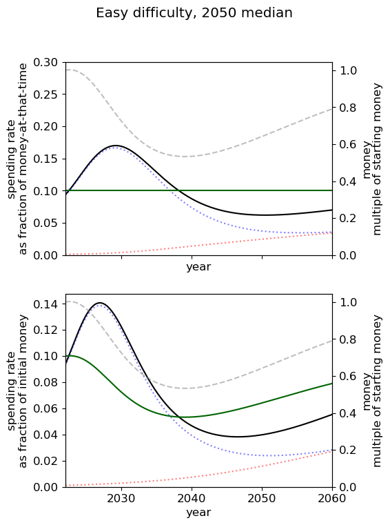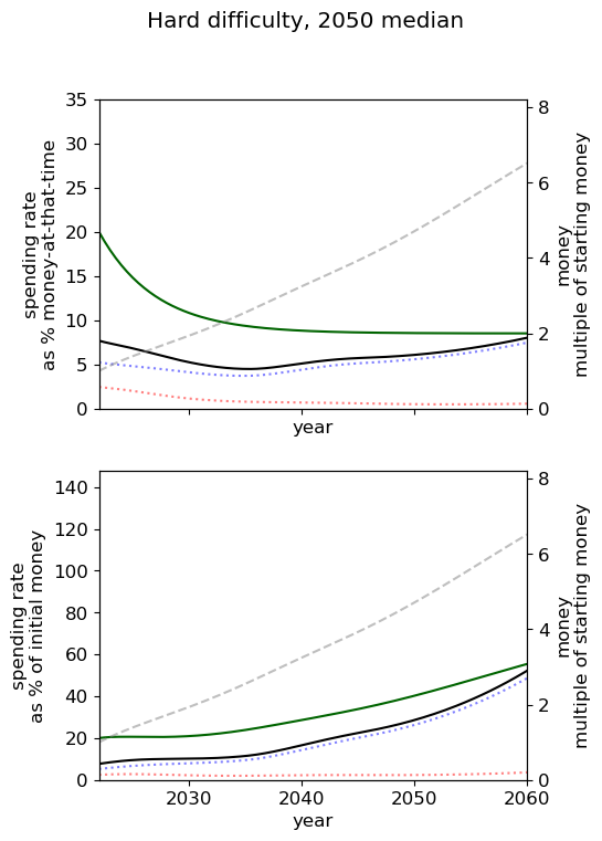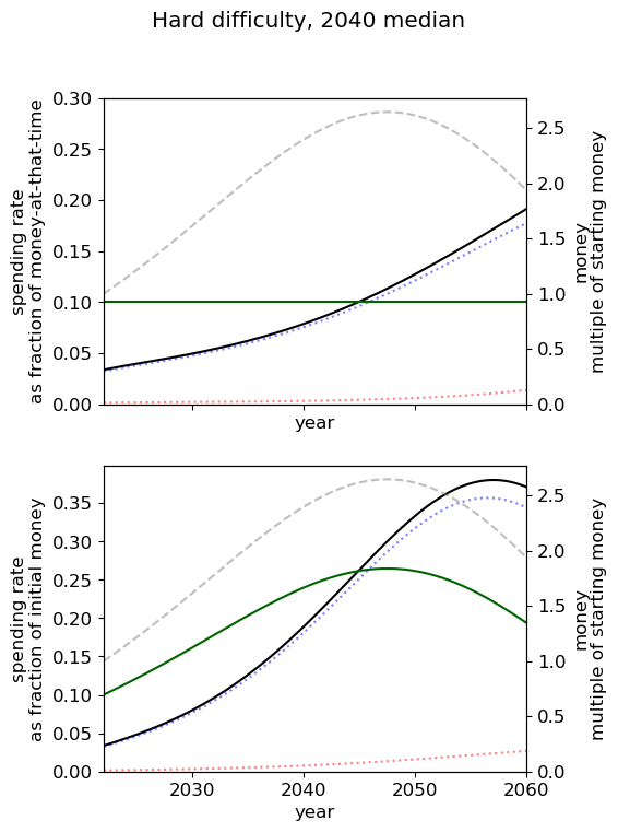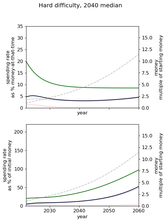 - Of all simple spending schedules that consider two regimes: now until 2030, 2030 onwards, the best strategy is to spend ~8% per year until 2030, and ~6% afterwards.