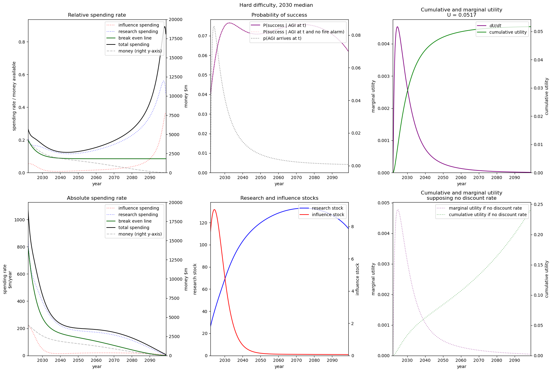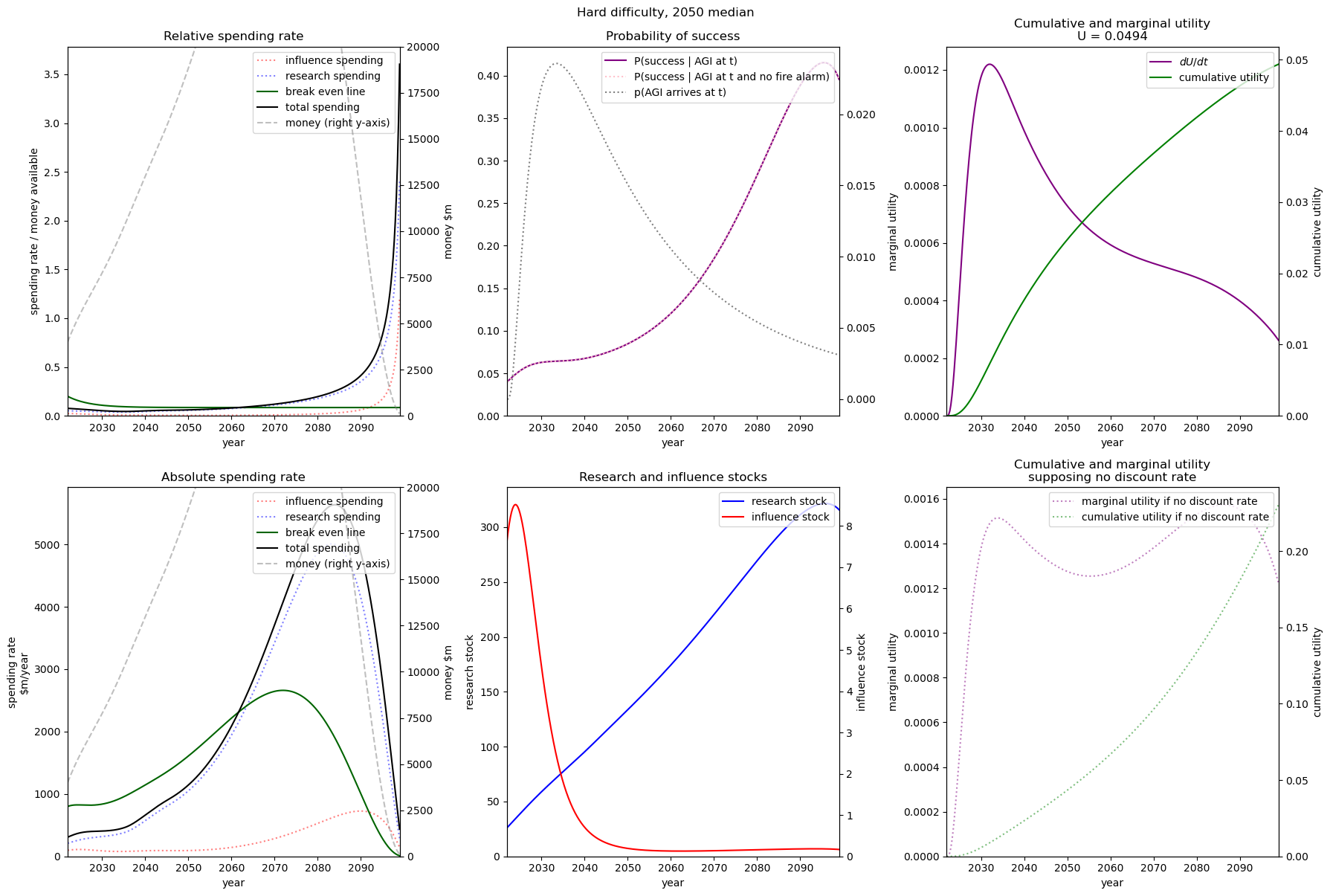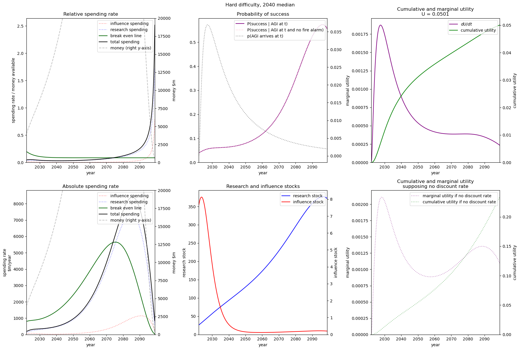 We see that even with practically no money we still achieve some utility. This is because both (1) the probability of success is non-zero when we have no research or influence, and (2) we already have some research and influence that will depreciate over time with no further spending.