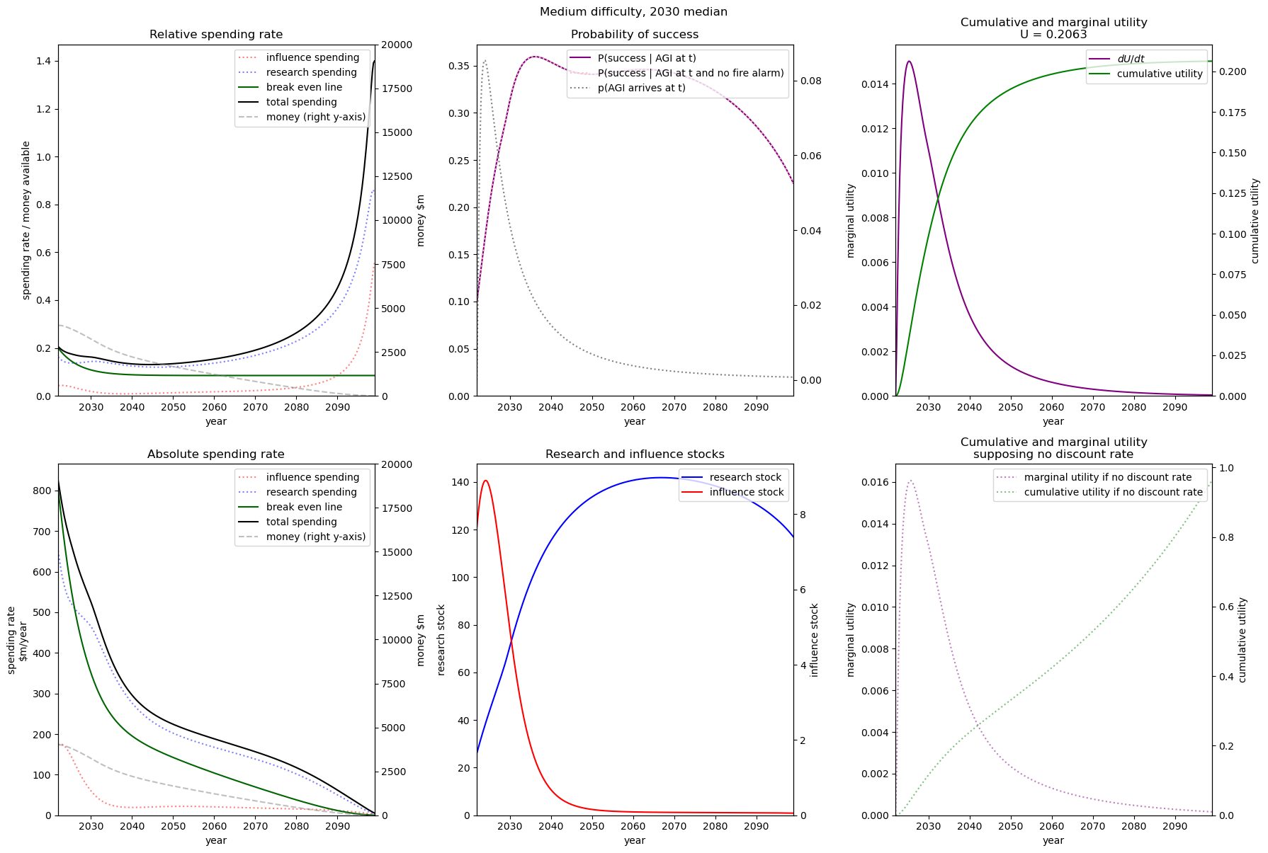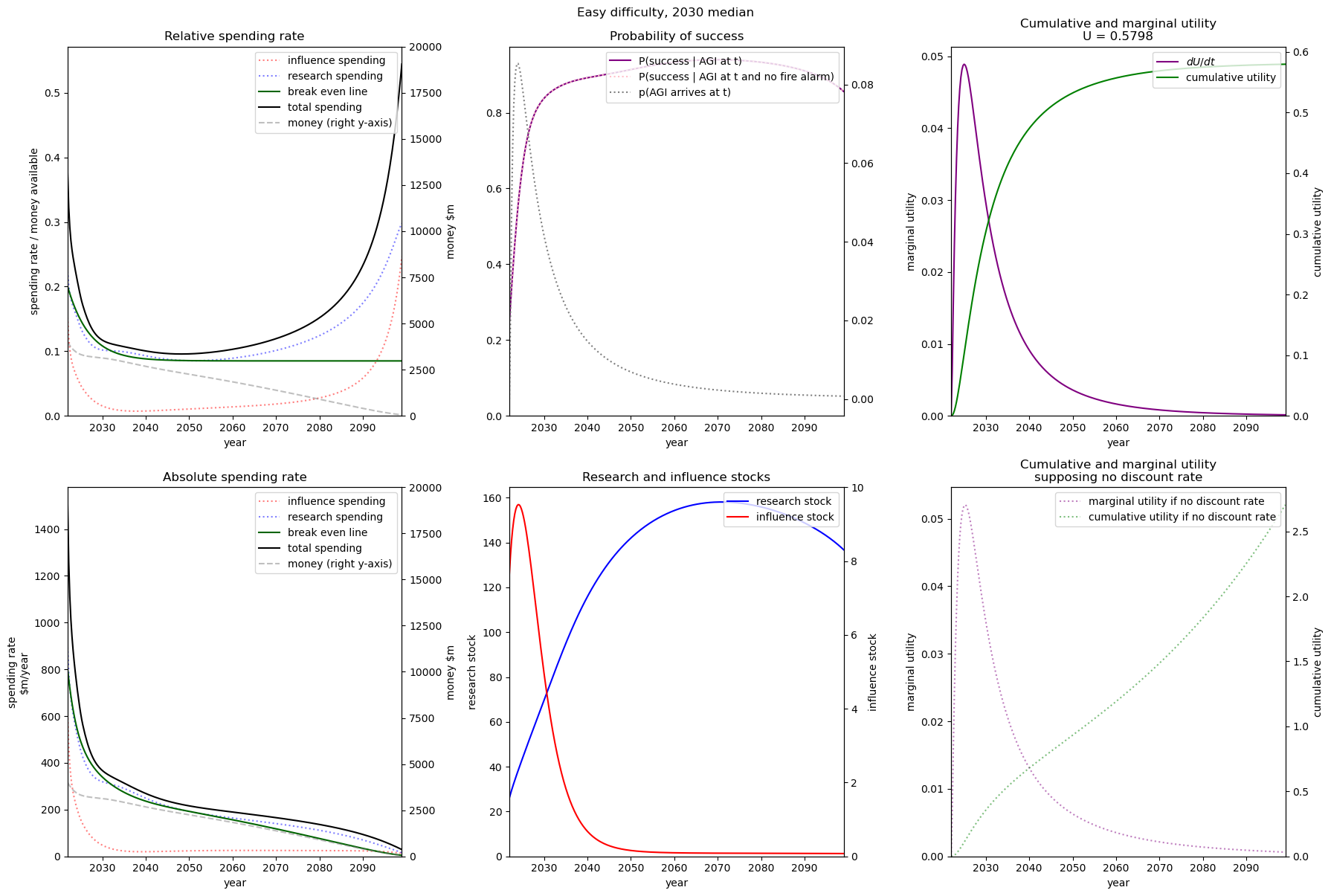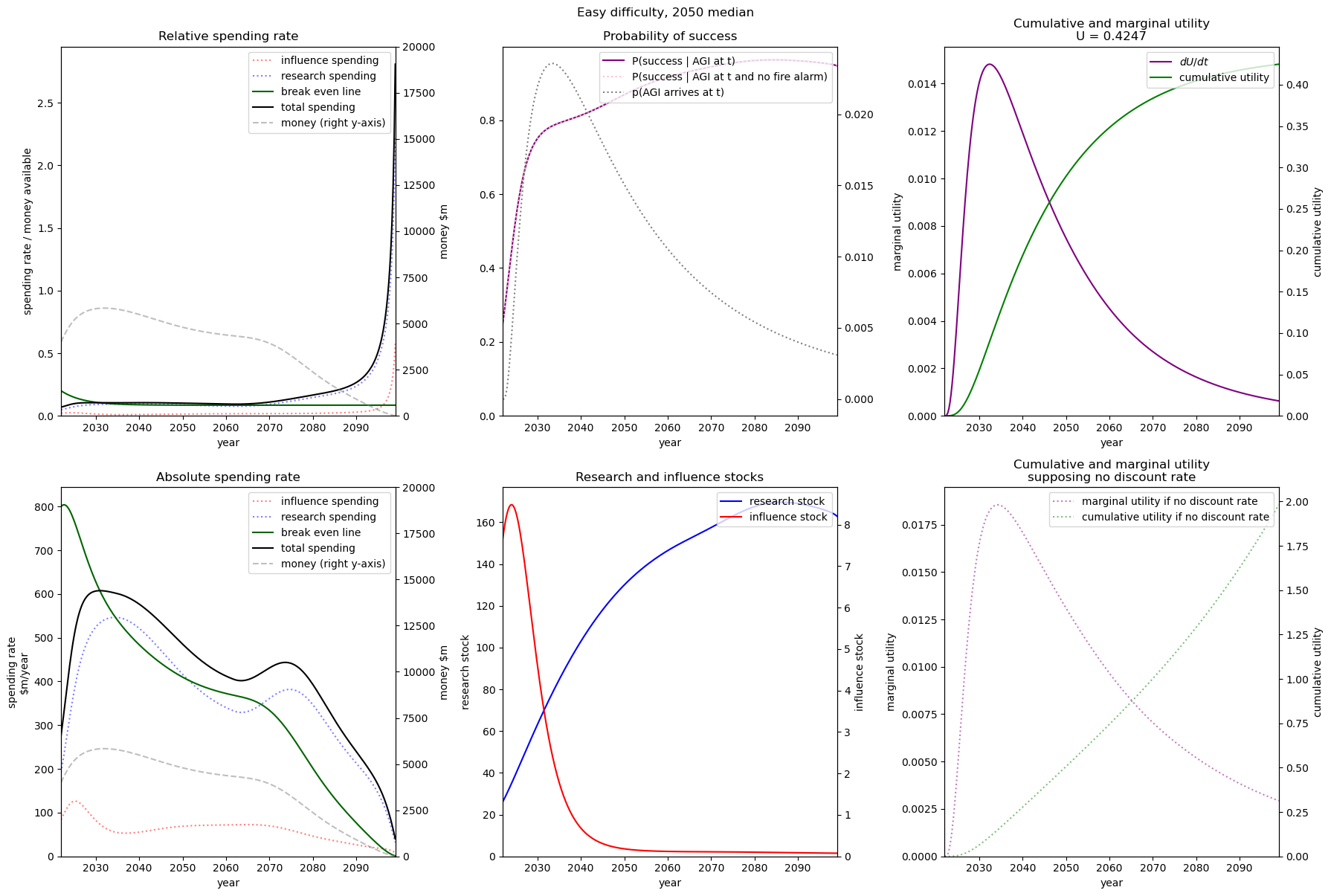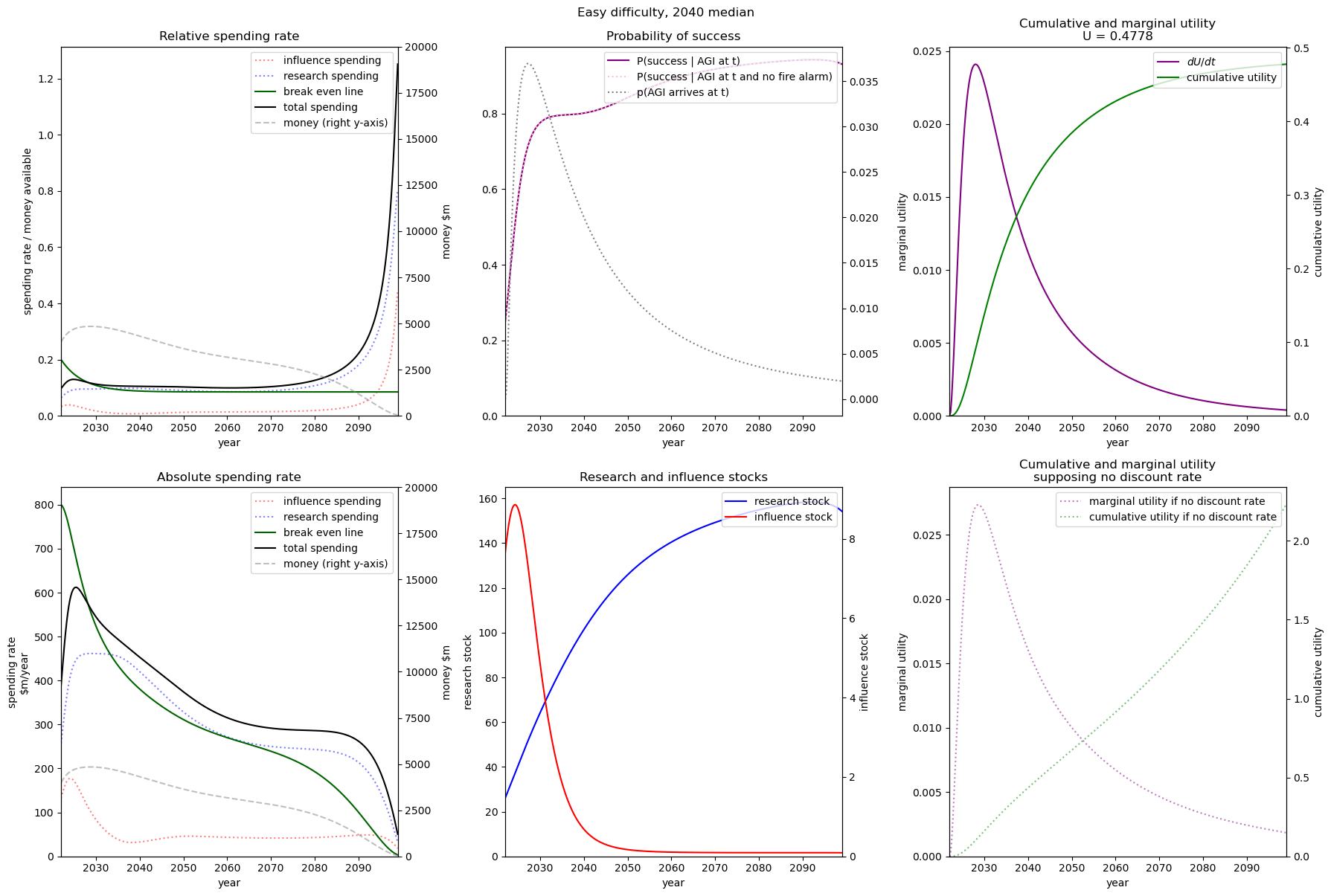 We see that even with practically no money we still achieve some utility. This is because both (1) the probability of success is non-zero when we have no research or influence, and (2) we already have some research and influence that will depreciate over time with no further spending.