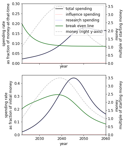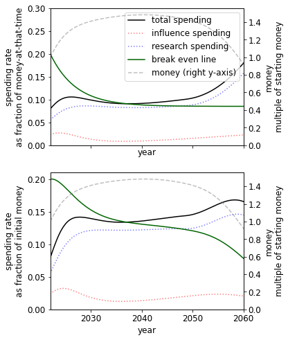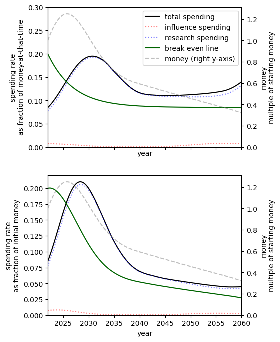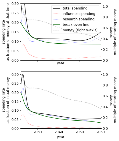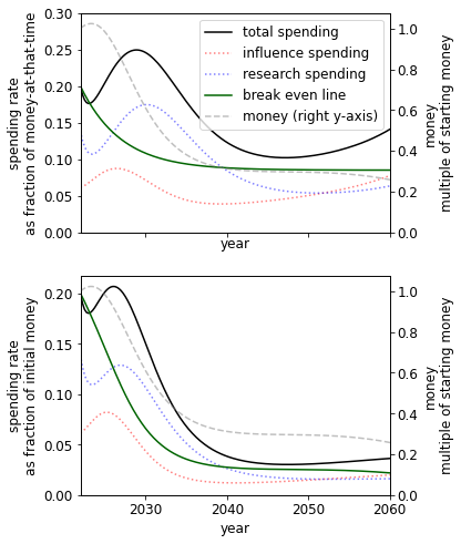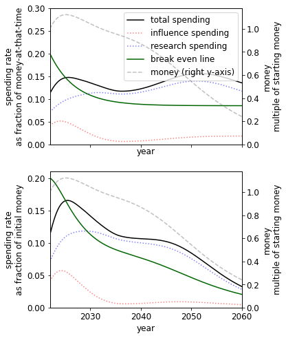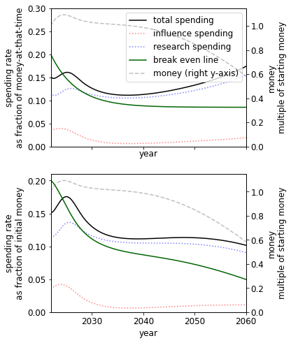 A different initial endowment has qualitative effects on the spending schedule. For example, comparing the 10% to 1000% case we see that when we have more money we - unsurprisingly - spend at a much higher rate. This result itself is sensitive to the existing stocks of research and influence.