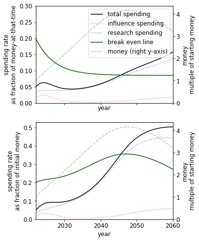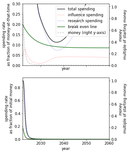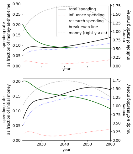 The key finding of a higher spending rate is supported by two distinct models we have created, one that splits spending of capital into research and influence, and a second model (the ‘alternate model’) that supposes we can spend our stock of things that grow on direct work. We focus on the former with the latter described in the appendix since its output is more obviously action-guiding[3].