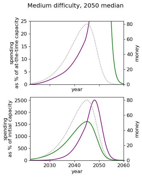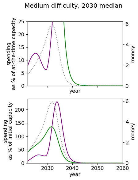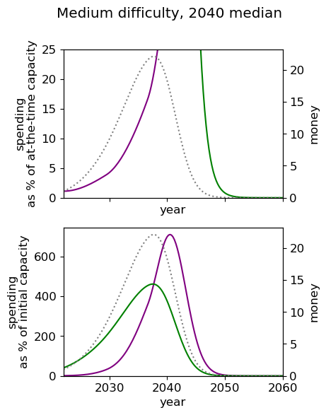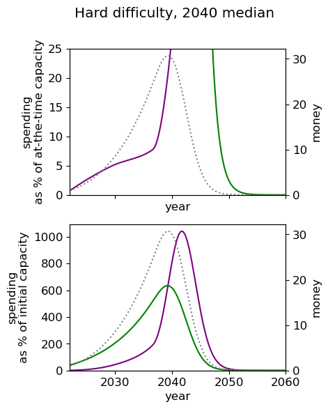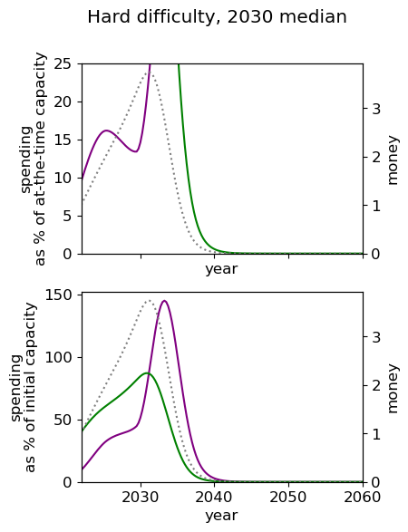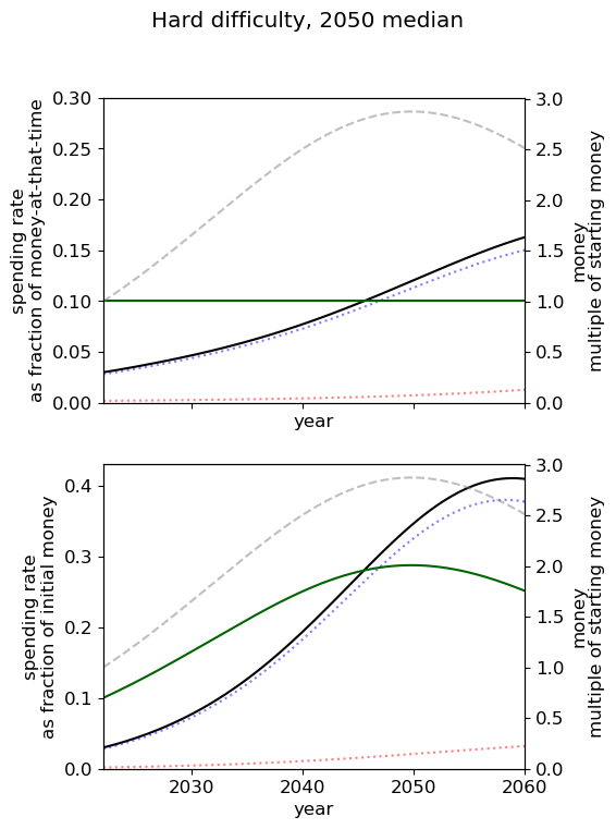The greatest difference in utility comes from cases where it is optimal to spend lots of money now, for example in the (2030 median, hard difficulty) world, the optimal spending schedule is 15% better than the default strategy.