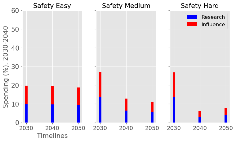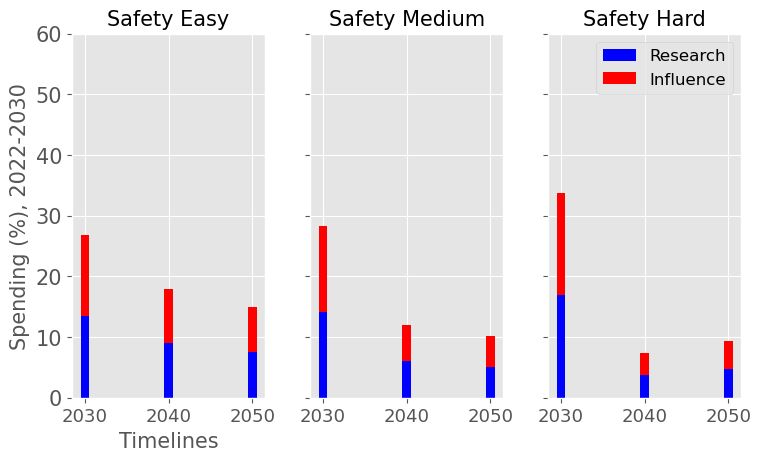 For each level of difficulty and each AI timelines, the average allocation between research and influence looks balanced. Indeed, research and influence both share roughly half of the total spending in each scenario. Looking closer at the results in the appendix, we observe that influence seems to decrease more sharply than research spending, particularly beyond the 2030 decade. This is likely caused by the sharp increase in the level of competition over AI development making units of influence more costly relative to units of research. Although we want to emphasise that the share of influence and research in the total spending schedule could easily change with different diminishing returns in research and influence parameters.