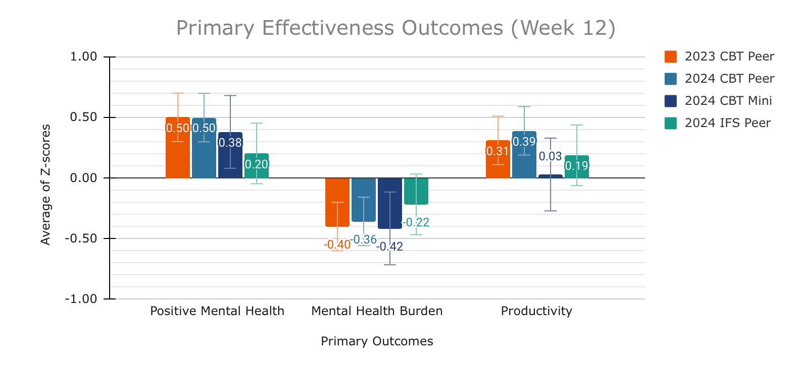 As part of our goal to increase the cost-effectiveness and reach of our services even more, we developed and tested two additional programs: the IFS Lab and the CBT Lab Minimum Guidance. Both show promising mental health benefits but lack a significant pre-post effect on productivity. We will publish dedicated reports for each of these program versions soon. Those pilots indicated that the effort we put into the standard guidance is worth the incremental benefits and that IFS doesn’t improve mental well-being aspects significantly after 12 weeks in the guided self-help format.