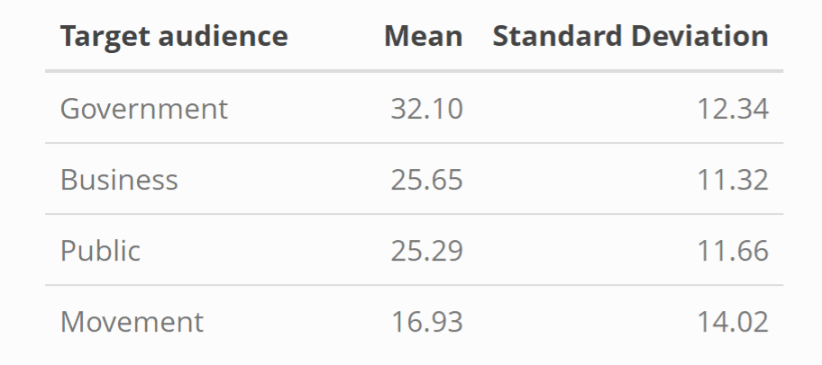 - Respondents prioritized targeting businesses (Mean allocation=32%), the movement itself (26%), and governments (25%) over the greater public (17%).