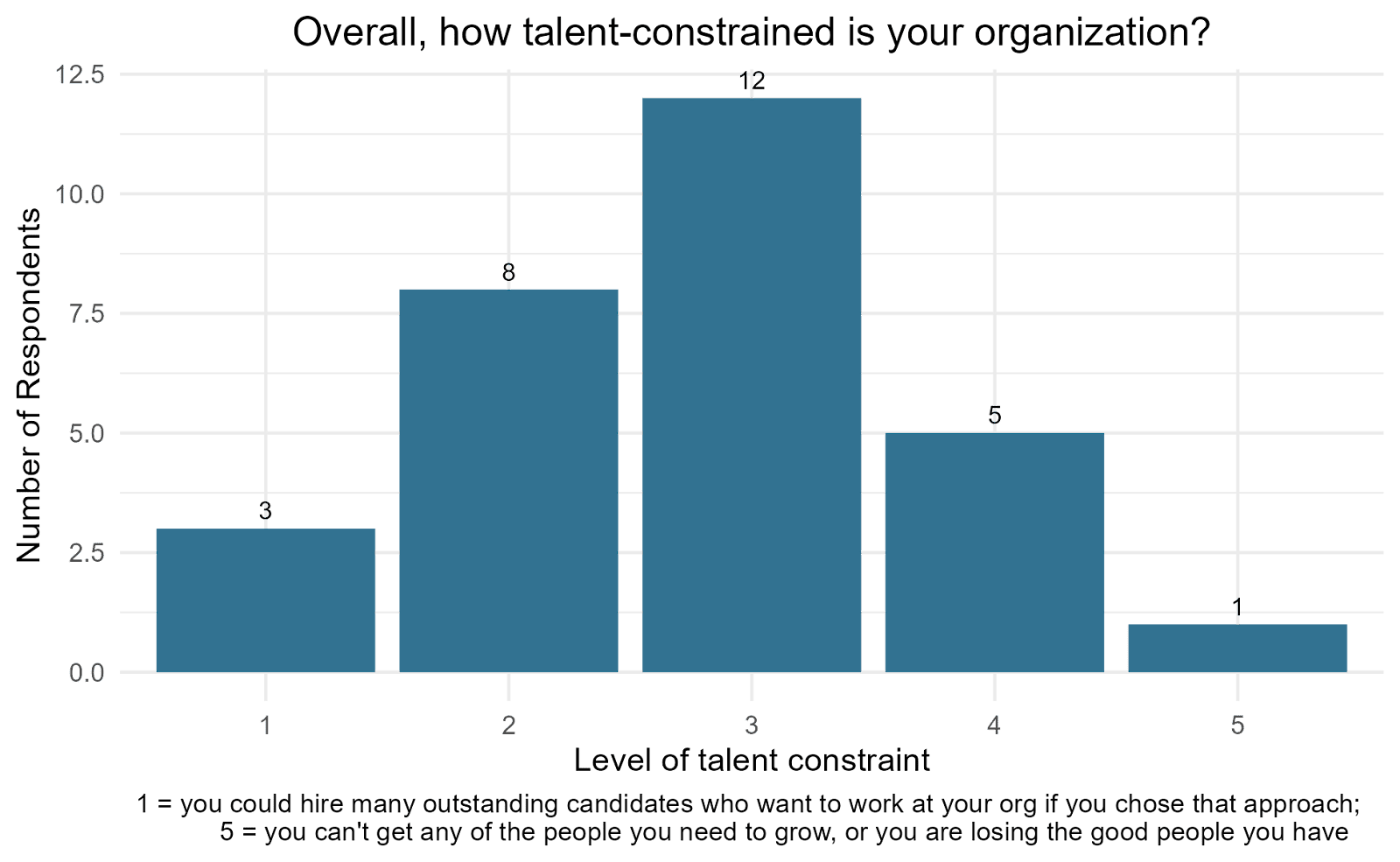 Asked to rate the level of talent constraint faced by their organization from one to five, only a fifth of respondents felt that their organizations were talent-constrained. On the other side of the spectrum, a third of respondents leaned towards no talent constraint at all. Twelve respondents selected option 3, suggesting no particular difficulty or ease in hiring or talent retention.