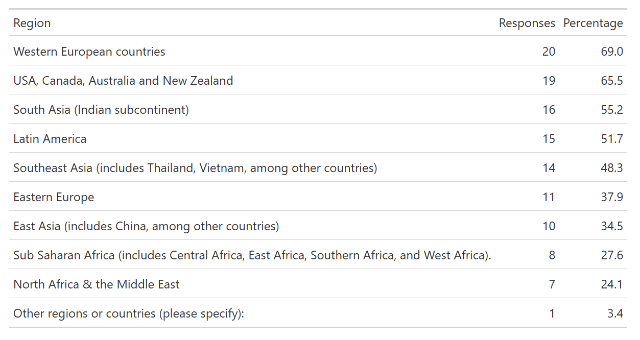Table: Percentage of respondents whose organizations operated in any given region