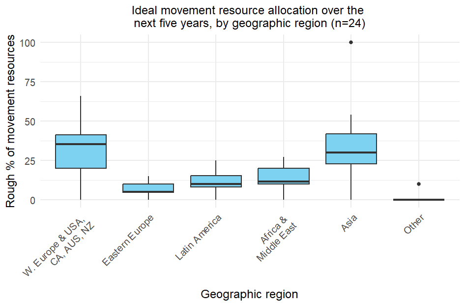 According to respondents, regions to which allocate the bulk movement’s funds over the next five years were Asia[4] (Mean= 33%), and so-called “Western” countries[5] (32%, or 39% when including Eastern European countries). At the same time, these regions had very high standard deviations (20% and 16% respectively, compared to less than 10% for other regions), indicating that respondents were quite divided on these. Additionally, it’s worth noting that the prioritization of Asia over “Western” countries is likely driven by an outlier (value on the extreme end of the dataset).
