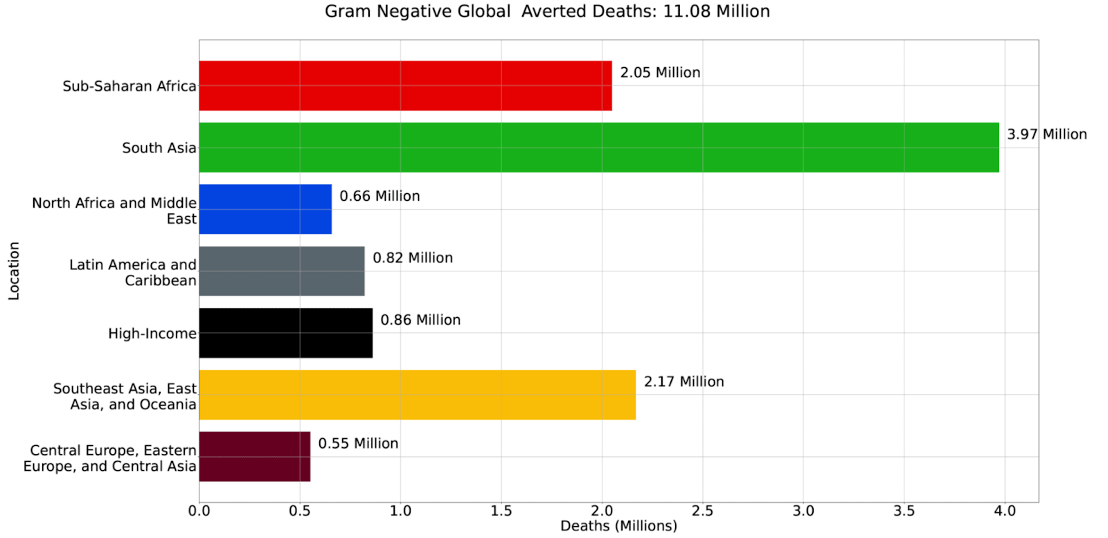 The study also projects the “Gram-negative” scenario to avert 11 million deaths cumulatively between 2025 - 2050, which assumes adequate funding and development of a global drug pipeline regularly releasing new, potent antibiotics targeting Gram-negative bacteria, in particular to address rising carbapenem resistance. Similar to the “better care” scenario, benefits would accrue primarily to older people in developing countries, although millions of children would avoid dying of AMR infections as well. Of course, as the study authors note, the “drug development vs better care” framing is a false dilemma; countries should fund and support both. Figure from Appendix I in the new Lancet study