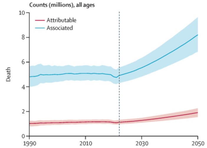 Over a million deaths a year worldwide have been attributable to bacterial AMR since 1990 and nearly 5 million a year associated with it, underscoring how AMR has been a leading cause of mortality for decades. This burden is set to increase dramatically in the coming years under the most likely scenario (more below). Figure from the new Lancet study