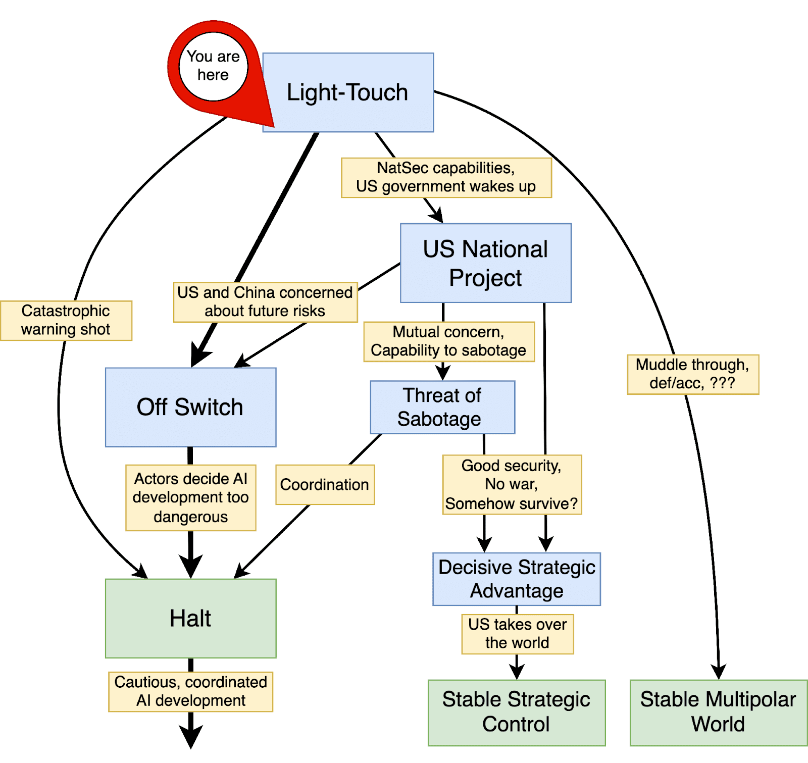 Light-Touch is similar to the current world, where the government takes a light-touch approach to regulating AI companies. We have not seen a credible story for how this situation is stable in the long run. In particular, we expect governments to become more involved in AI development as AIs become strategically important, both militarily and economically. Additionally, the default trajectory will likely involve the open release of highly capable AI models. Such models would drastically increase large-scale risks from malicious actors, for instance, by assisting with biological weapon development. One approach discussed previously to remedy this situation is defensive acceleration: investing heavily in defense-oriented technologies in order to combat offensive use. We are pessimistic about such an approach because some emerging technologies—such as biological weapons—appear much easier to weaponize than to defend against. The Light-Touch approach also involves similar risks to those in the US National Project, such as misalignment and war. We think the Light-Touch scenario is extremely unsafe.