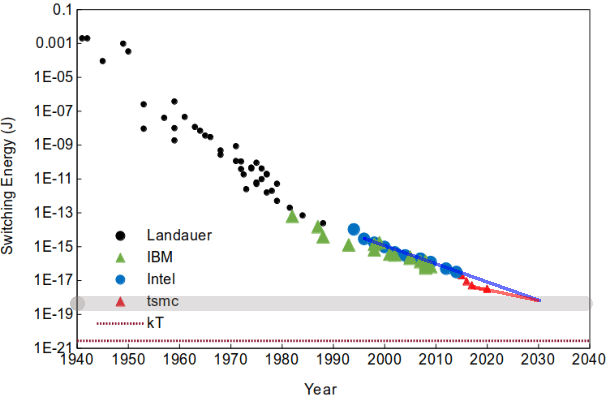 We are already quickly approaching the key practical limit on reliable switching energy of around 1e-18J[37]: