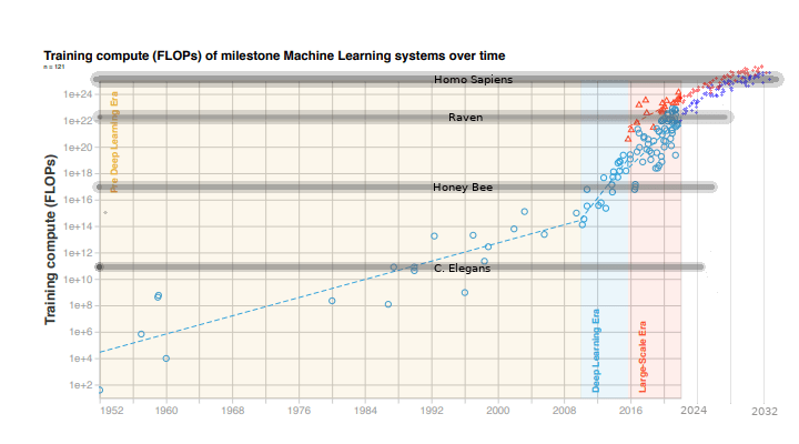 I've extrapolated the two main trends from "Compute trends across three eras of machine learning" including my current best estimated adjustments for the approaching end of key Moore's Law subtrends (discussed below), and then added 4 brain equivelance milestones (C. Elegans, Honey Bee, Raven, and Homo Sapiens).