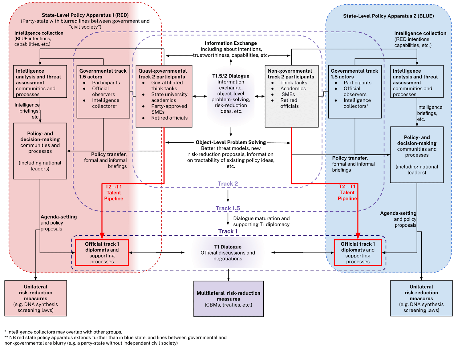 Track 1 diplomacy need not always displace track 2 efforts, however. Some track 2 dialogues can also supplement ongoing track 1 effort.[60] This is sometimes called “hard” track 2.[61] For example, a former official from the Founders Pledge-funded AI-bio dialogue mentioned above told Defense Scoop: