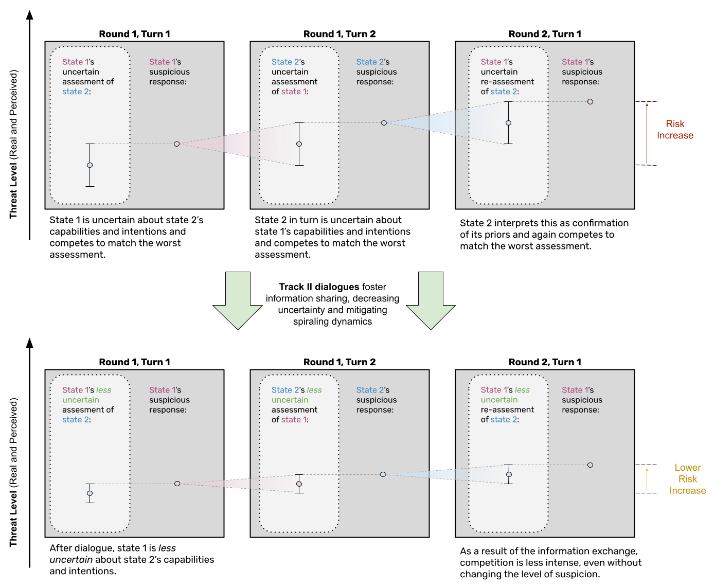 (Note that although we refer to the intentions or capabilities of a state, this theory of change does not rely on a unitary actor model of international relations. Rather, track 2 dialogues can affect different parts of a messy bureaucracy, including intelligence assessment, policy planning, and execution. Referring to a state’s “uncertainty” or “mistrust” is merely shorthand for this complex process and the aggregation of thousands of decisions and perceptions, some of which may be affected by track 2 dialogues.)
