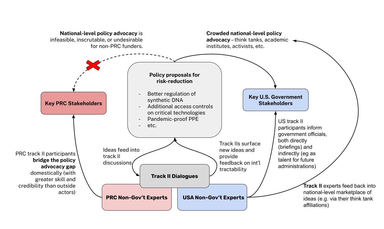 Organizers of dialogues have explained that this kind of intelligence collection and subsequent briefing of host governments are understood and expected.[22] Both sides tend to have an unspoken agreement that they will be briefing their country’s officials, even if no officials are present at the dialogue — as discussedbelow, this suggests that the border between “track 2” and “track 1.5” is fuzzy. For example, an official participating in U.S.-China track 2 dialogues on AI-bio risks (funded by Founders Pledge’s GCR Fund) recently told DefenseScoop that