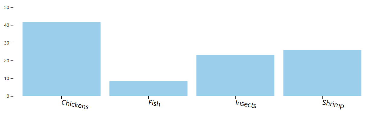 First, we estimate the variance in possible concrete effects of projects in that space. For example, the insect welfare space is relatively new, with few established projects, resulting in a high variance in possible effects. It’s not that unlikely that an insect project could benefit 1% of farmed insects, in which case it would help 10x the estimated scale number. There is also a good chance that insect projects will fail, as best practices in that field are still in development. The best chicken welfare projects are comparatively well-understood and established, resulting in lower variance.