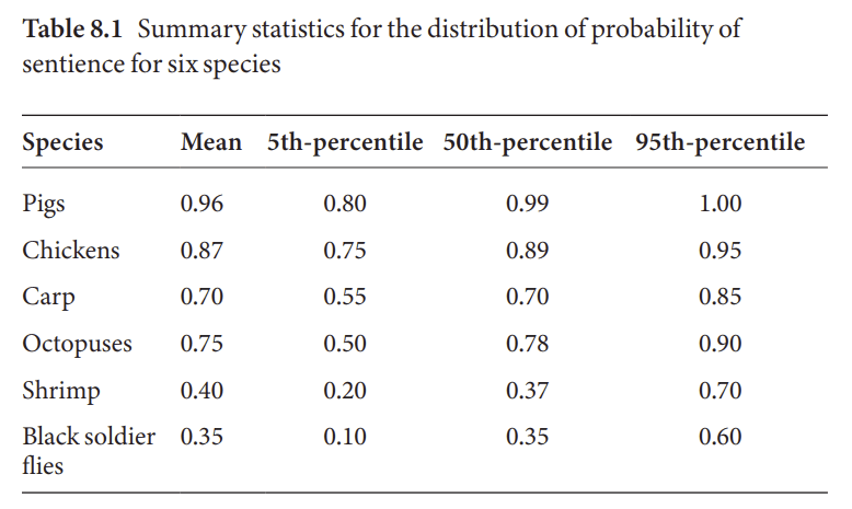 We used the mean estimates of the probability of sentience from Fischer, et al. (2024, 224):[2]