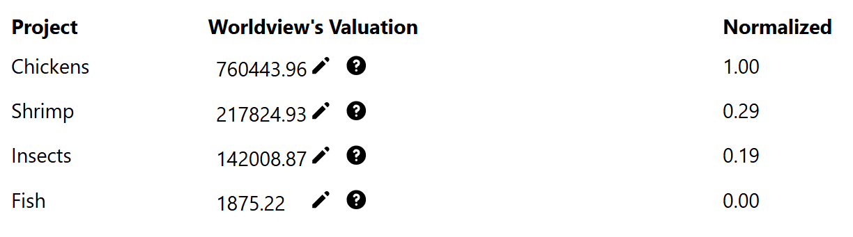 Finally, different worldviews will place different moral weights on the animals under comparison. We include two different sets of worldviews. First, we used RP’s mean welfare ranges. These were not weighted by the probability of sentience, since that was already accounted for in the risk dimension. Second, we used RP’s estimated welfare ranges based purely on neurophysiological proxies (such as neuron count), which give much lower estimates of welfare ranges (ibid.):