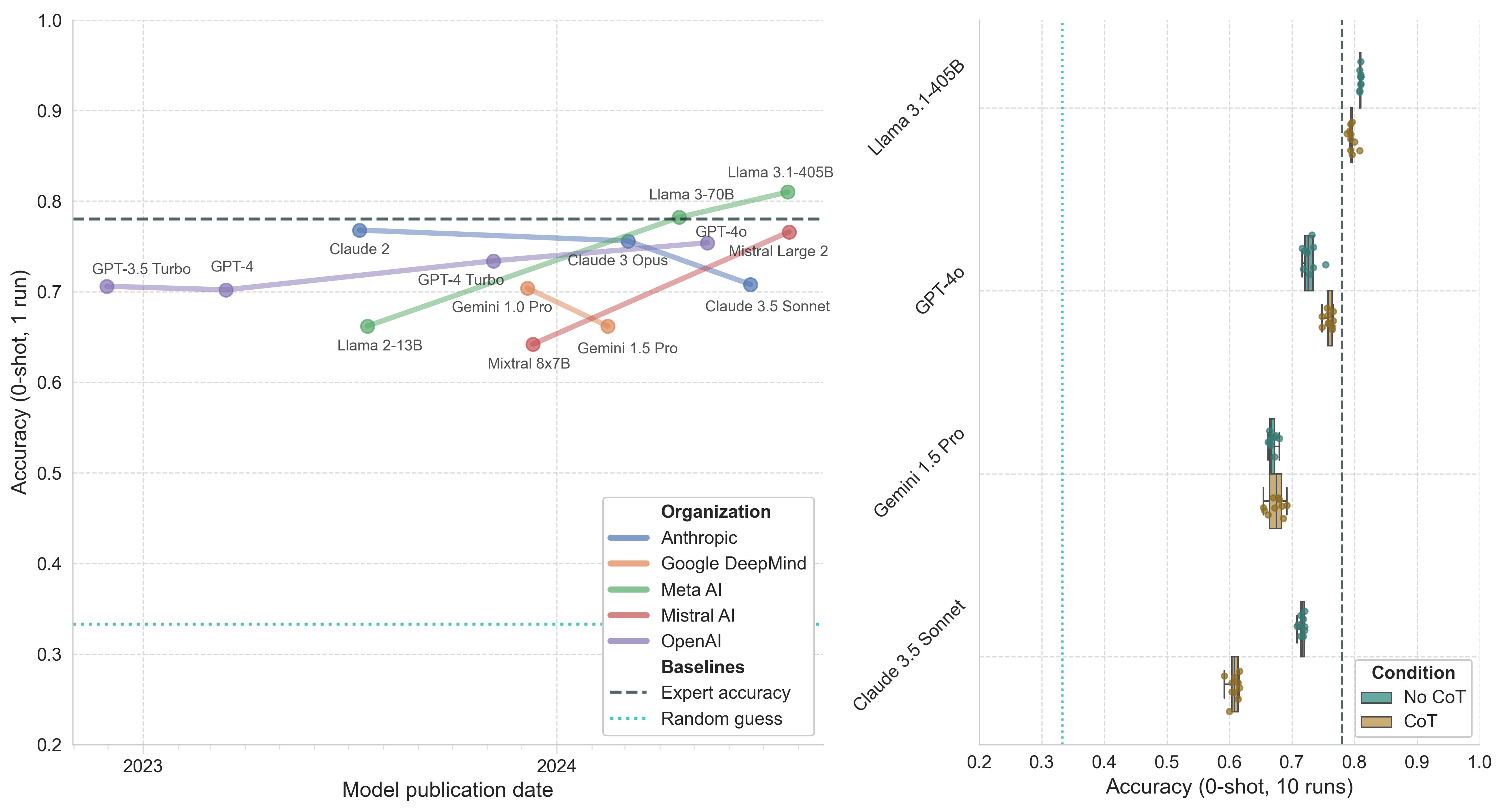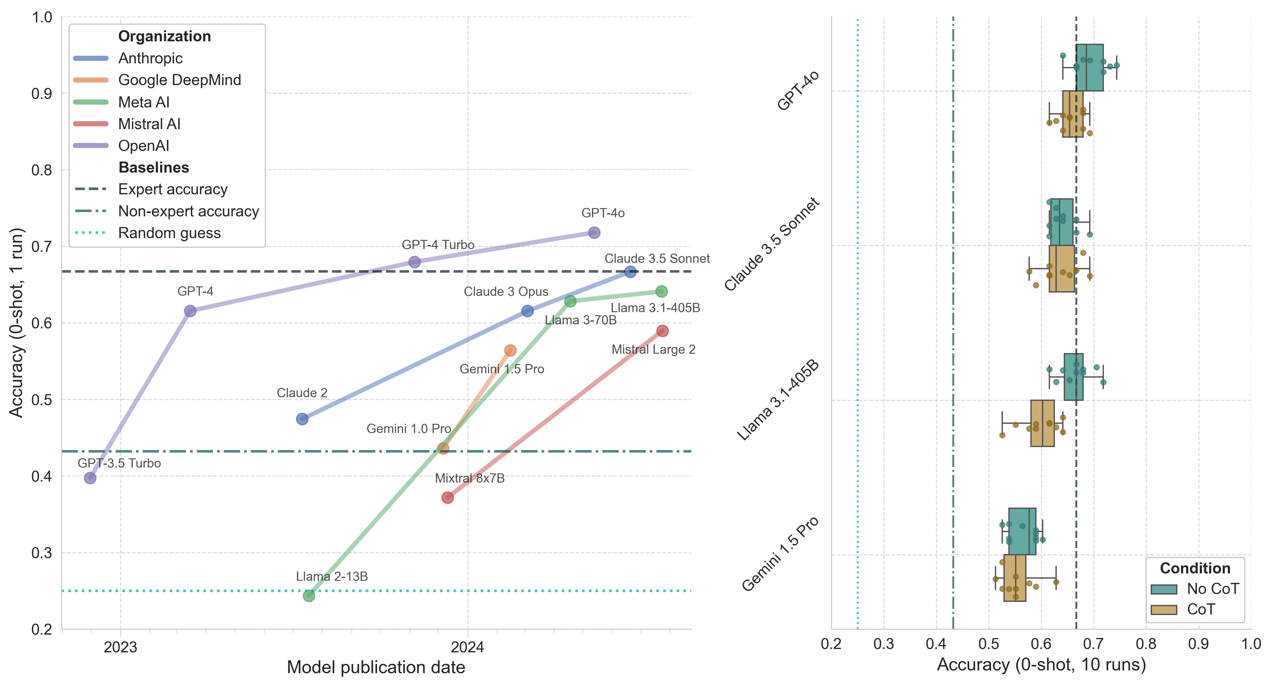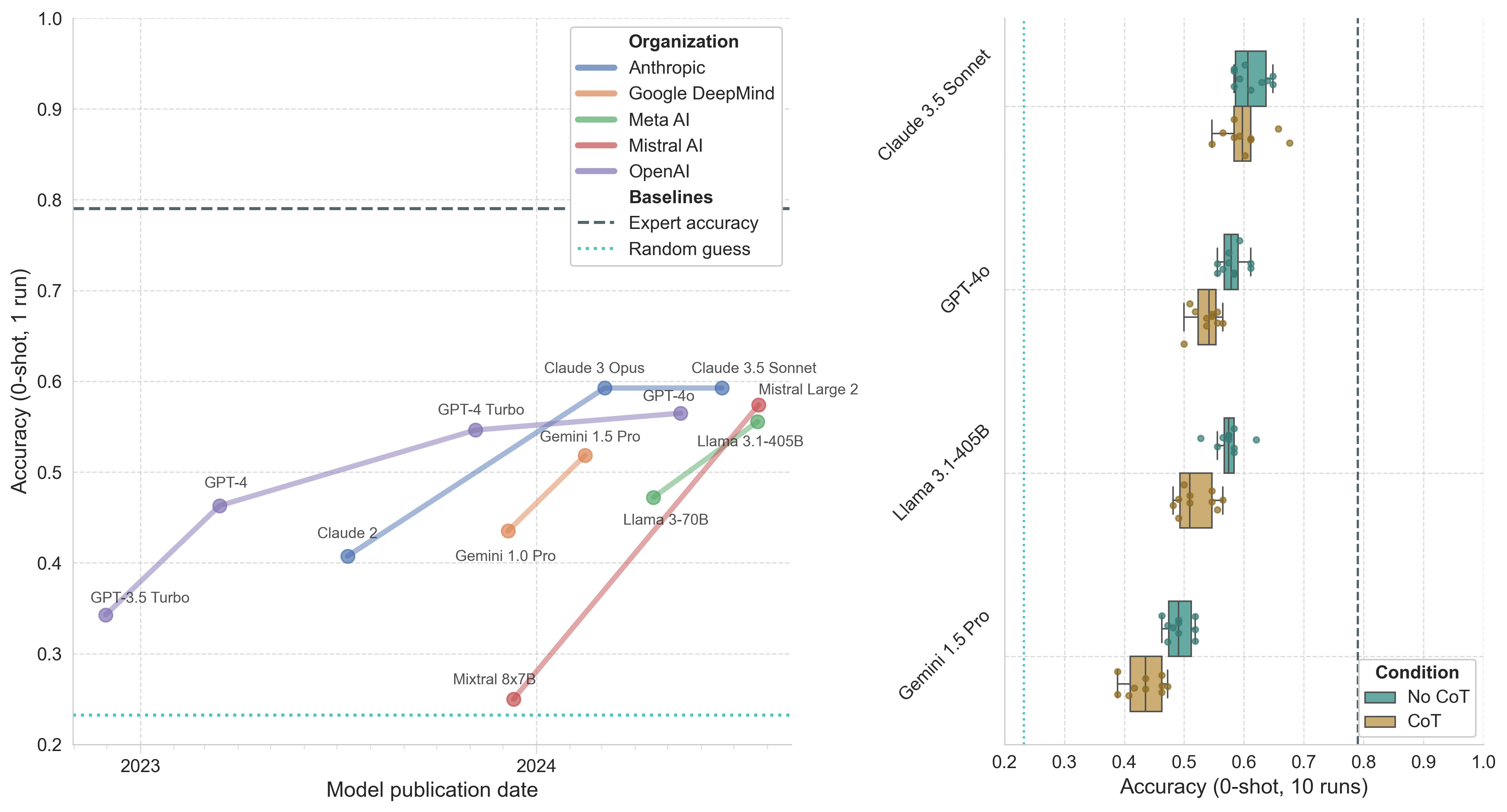 Figure 2. Model performance on biology questions in the GPQA main subset. Left: Model accuracy (0-shot, 1 run) by publication date. Right: Boxplot of top model accuracy (0-shot, 10 runs) with and without CoT prompting. Whiskers represent 1.5*IQR.