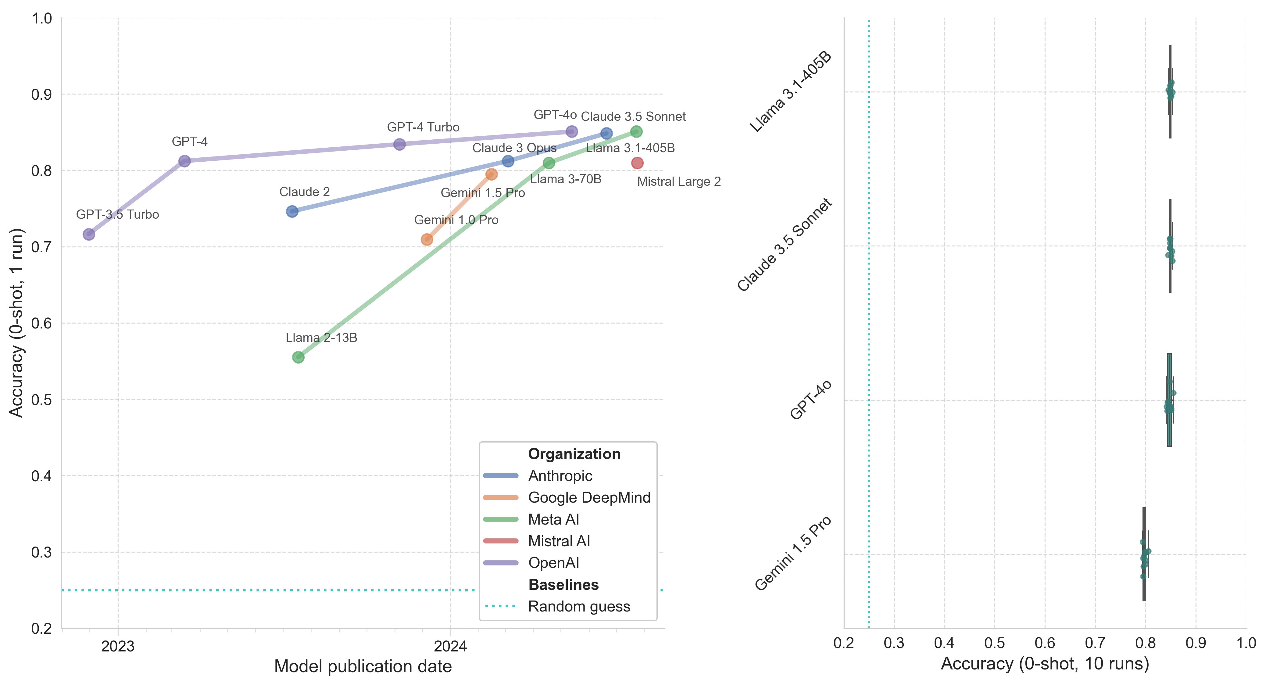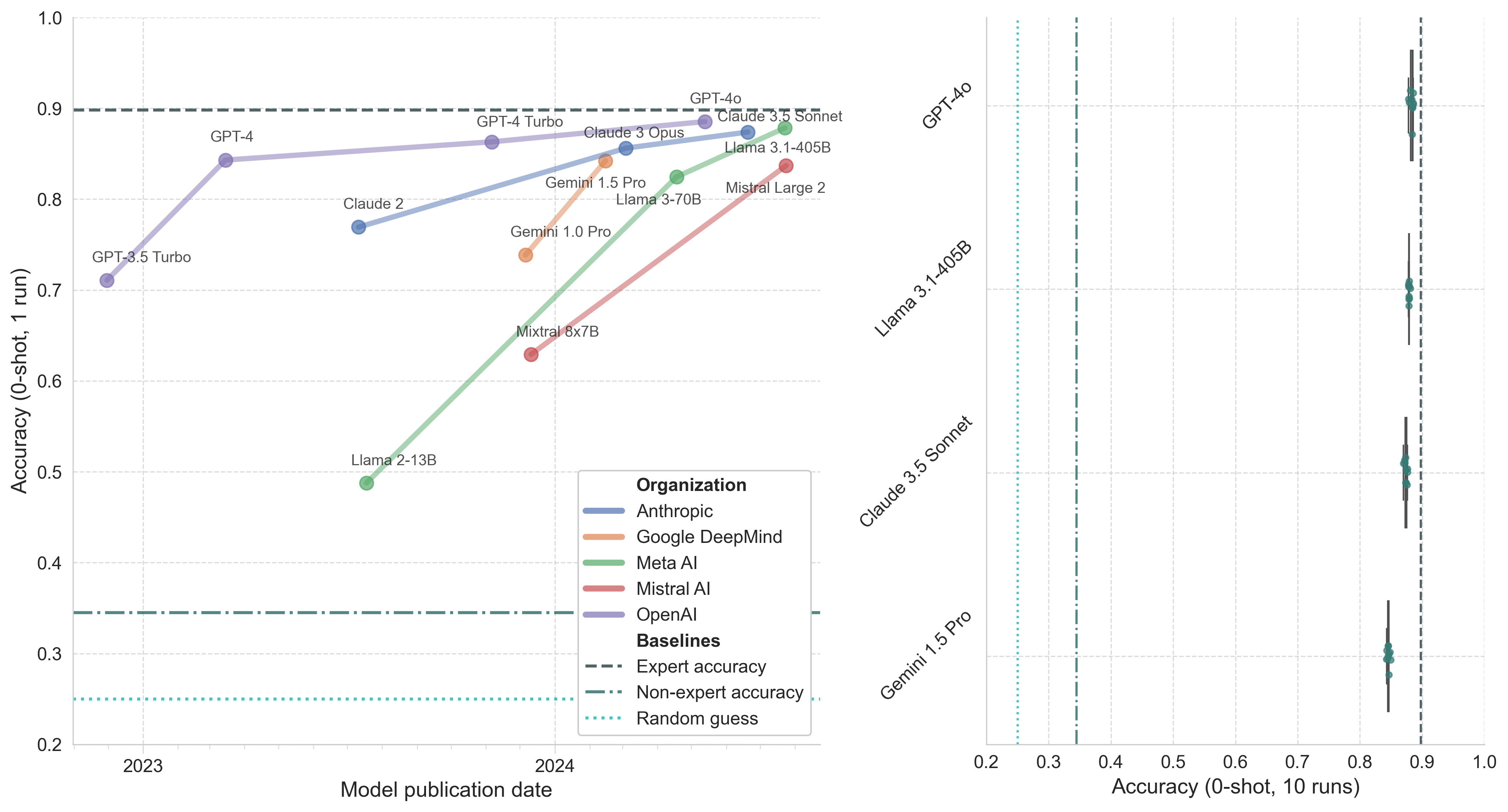 Figure 1. Model performance on biology-related questions in MMLU. Left: Model accuracy (0-shot, 1 run) by publication date. Right: Boxplot of top model accuracy (0-shot, 10 runs) with whiskers representing 1.5x the interquartile range (IQR).
