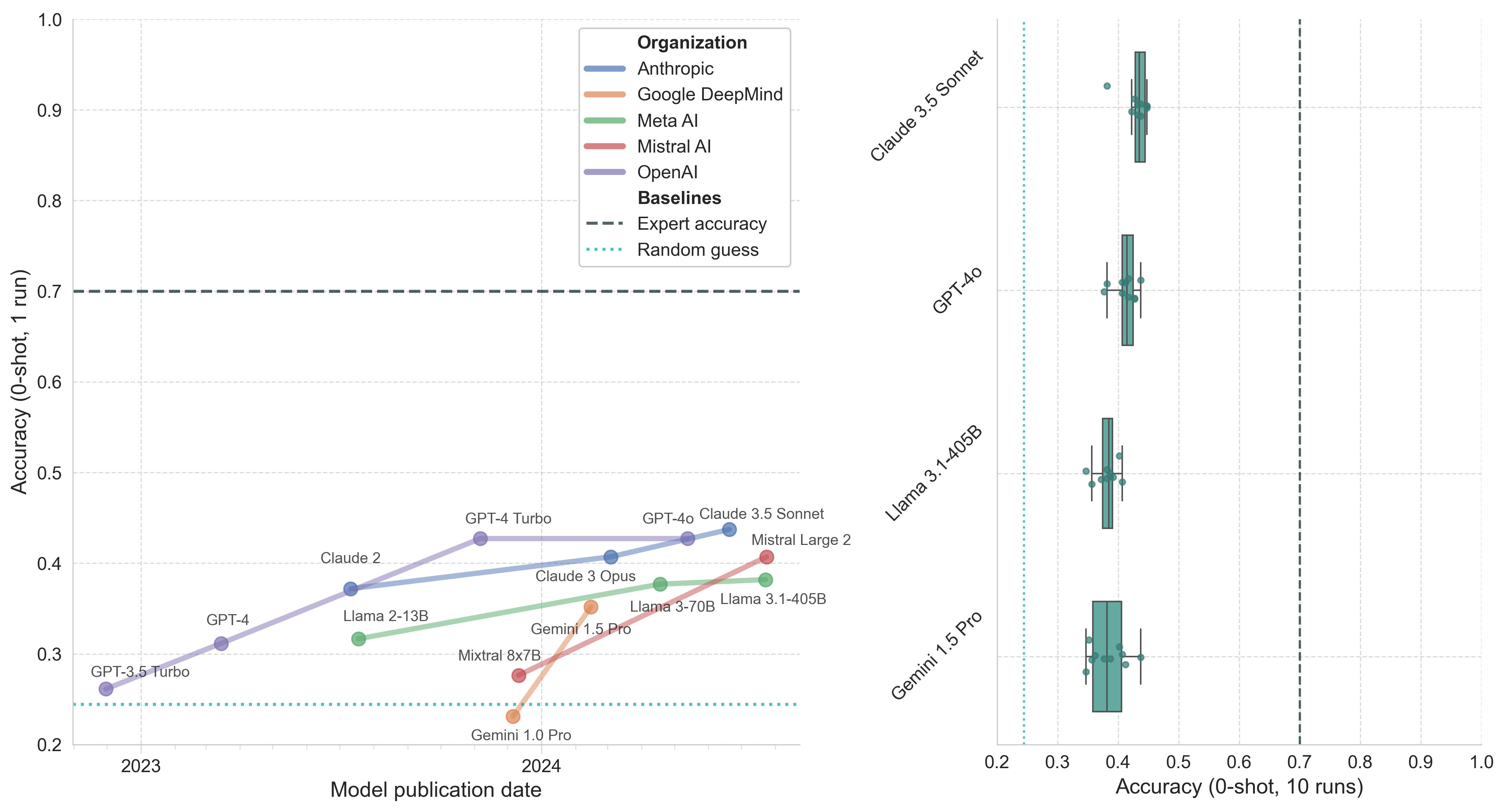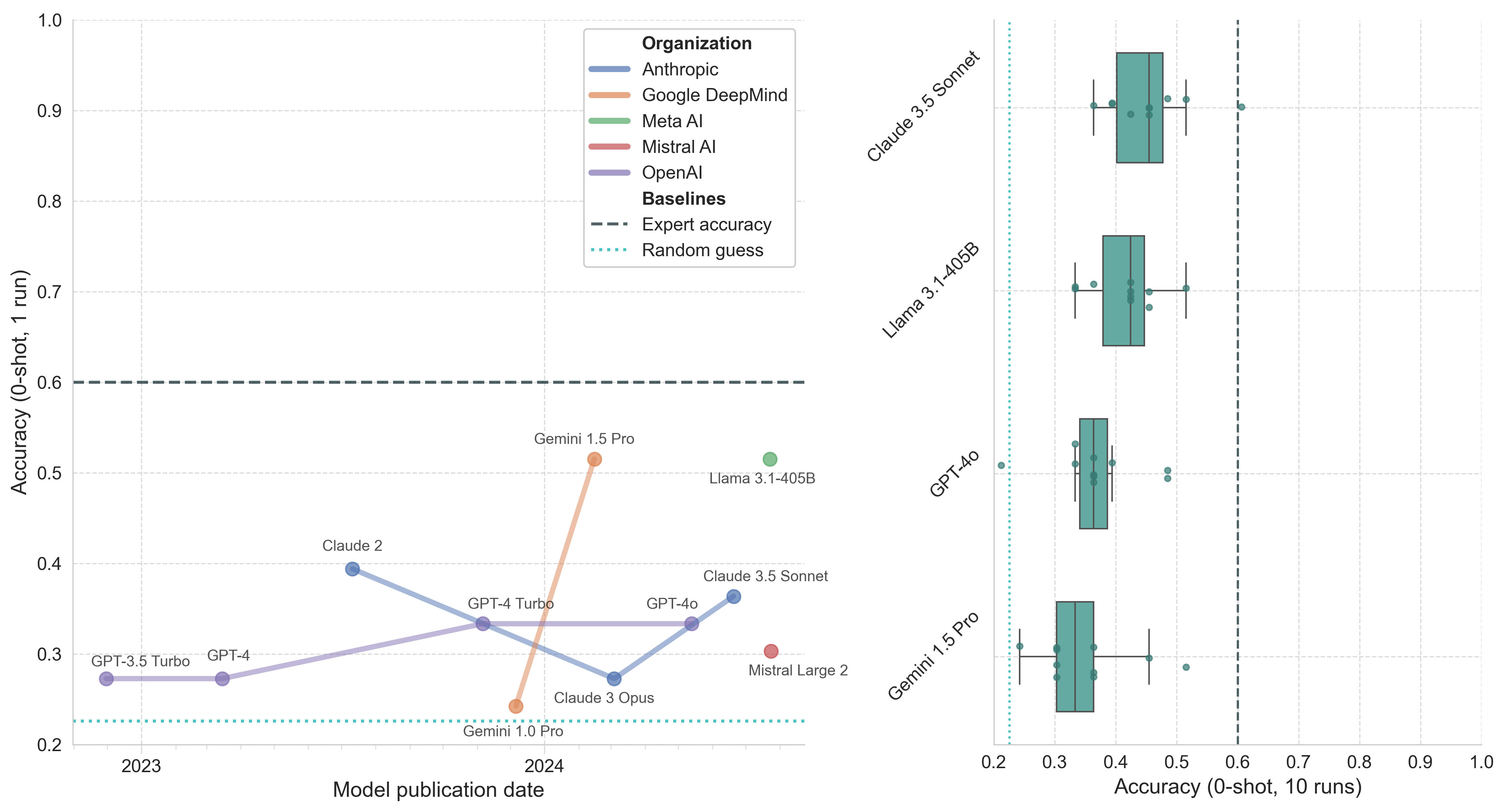 Figure 4. Model performance on the LitQA2 portion of LAB-Bench. Left: Model accuracy (0-shot, 1 run) by publication date. Right: Boxplot of top model accuracy (0-shot, 10 runs) with whiskers representing 1.5*IQR.