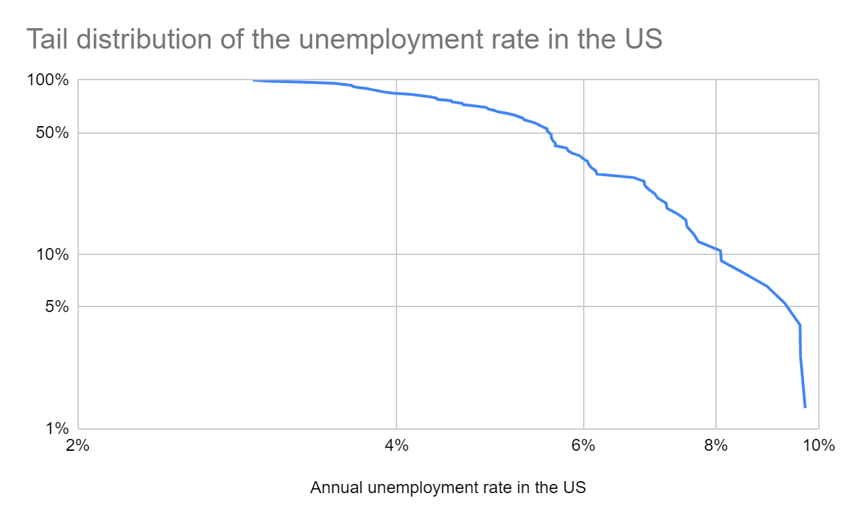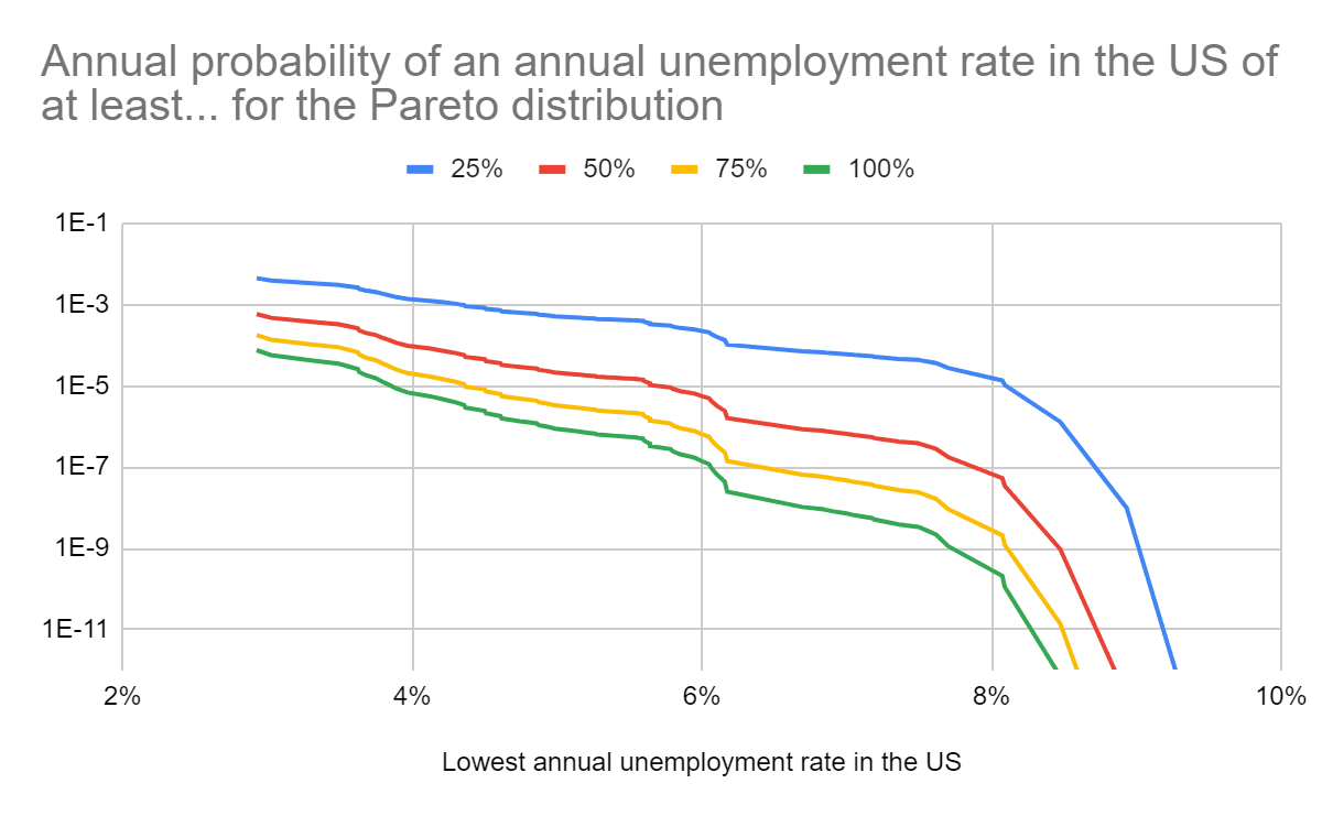 Then I obtain the annual probability of an annual unemployment rate in the US of at least 10 %, 25 %, 50 %, 75 % and 100 %. Note unemployment requires not only not having a job, but also being actively looking for one: