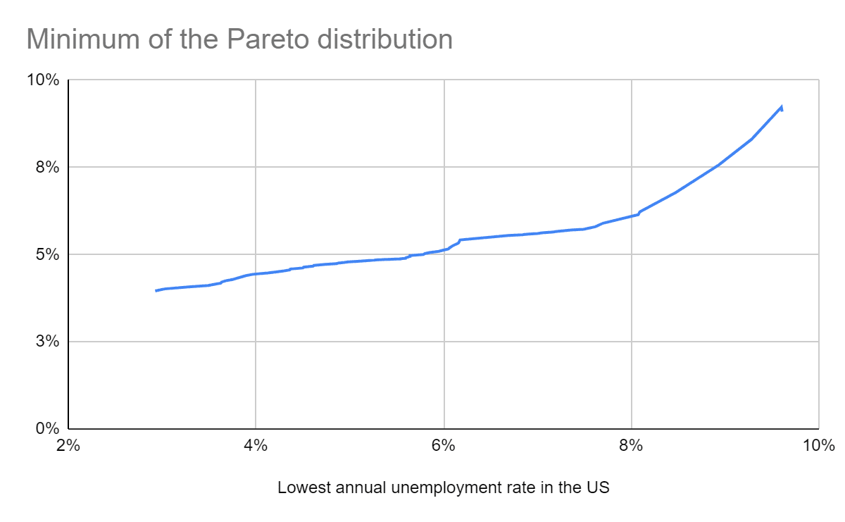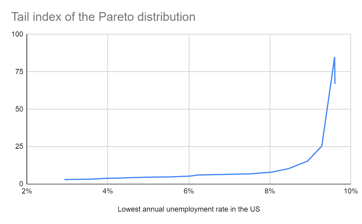I fit Pareto distributions (power laws) to the 2, 3, … and 76 (= 2023 - 1948 + 1) highest values of the annual unemployment rate in the US from 1948 to 2023. To do this:
