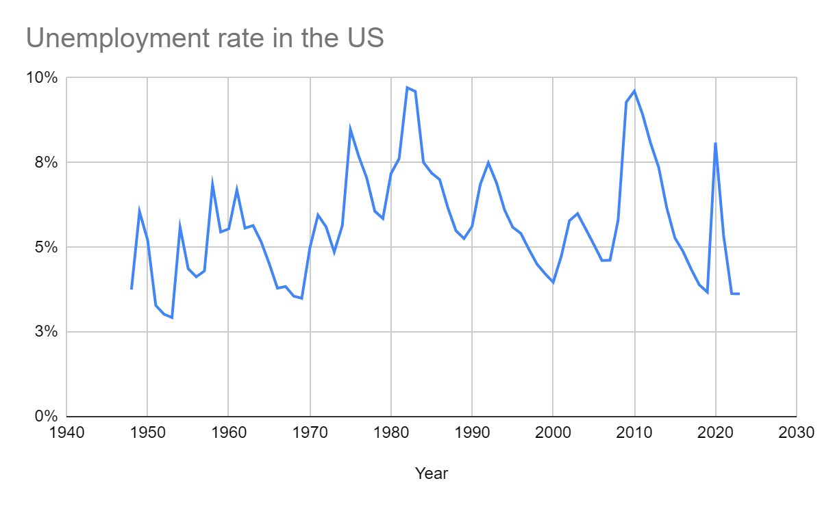 The 5th percentile, median and 95th percentile annual unemployment rate in the US from 1948 to 2023 were 3.54 %, 5.55 % and 9.02 %. The maximum was 9.71 % in 1982.