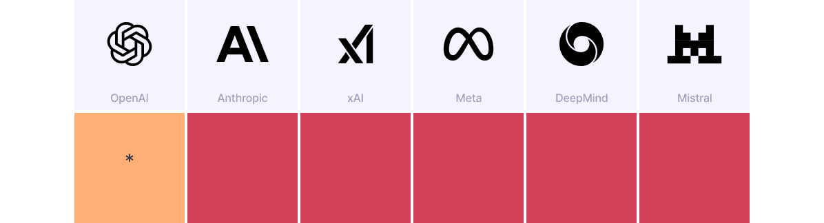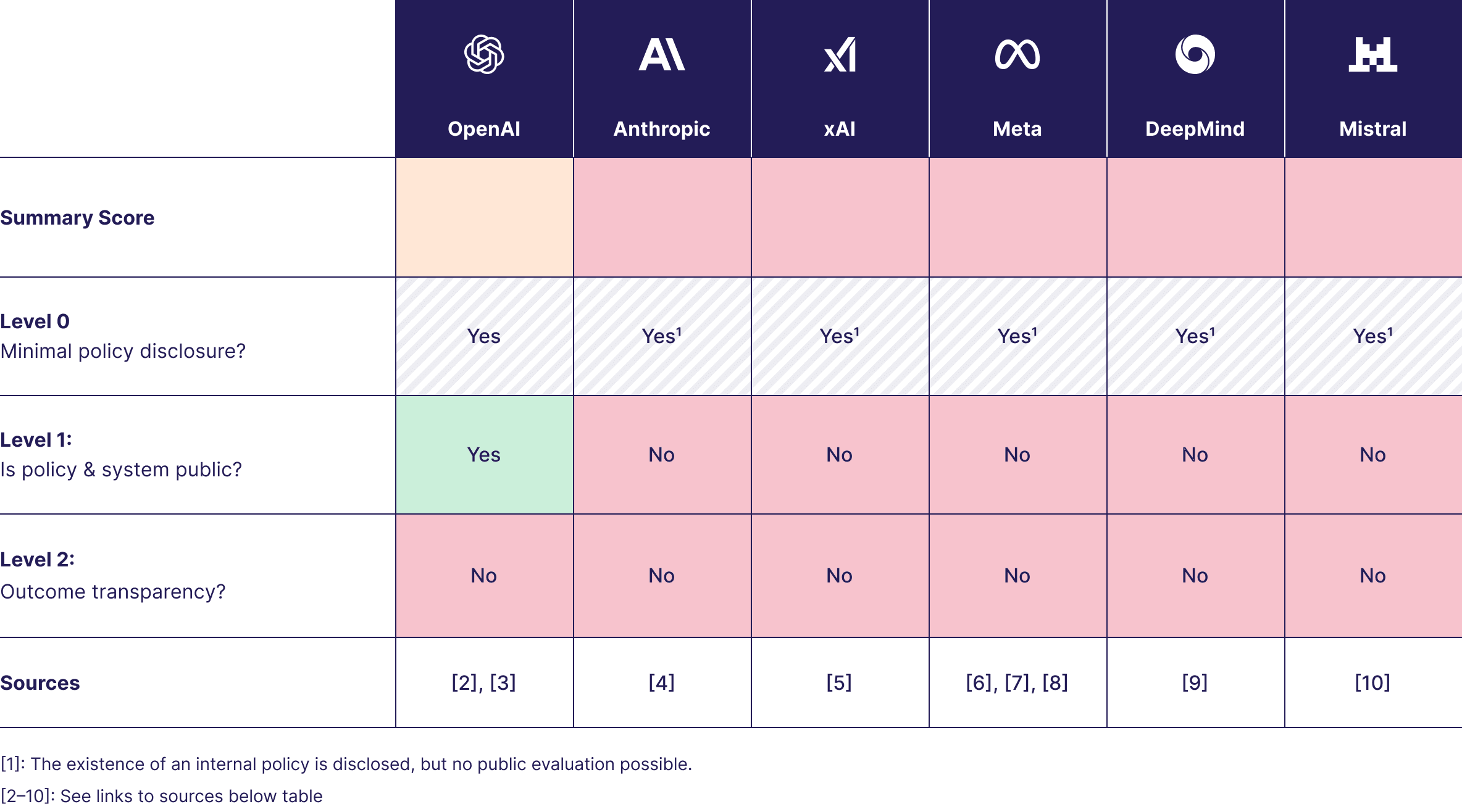OpenAI is the sole exception—and they only published their policy following public pressure over their restrictive non-disparagement clauses. Even then, none of the major AI companies publish effectiveness metrics or outcome data.