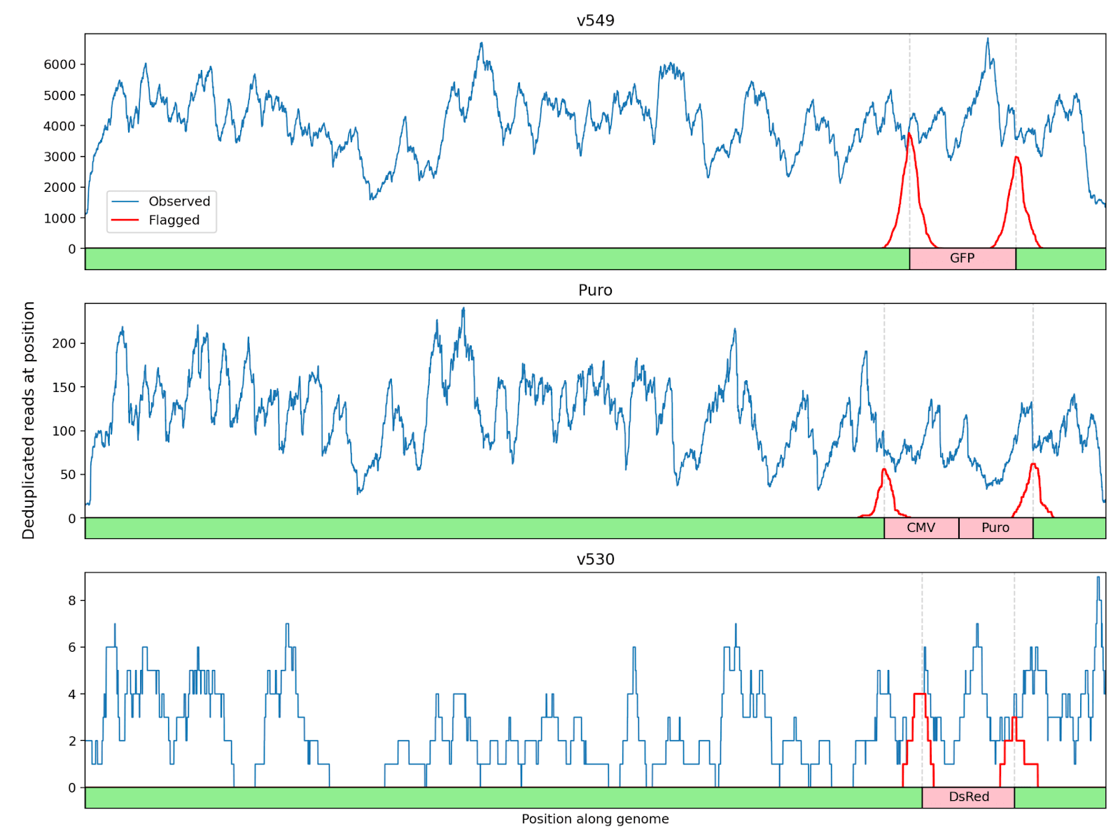 - Separately, we ran the raw data through our chimera-detection pipeline, which flags read pairs that are only a partial match to known viral genomes. Of these, we call the ones matching the junctions in question "Flagged Pairs".