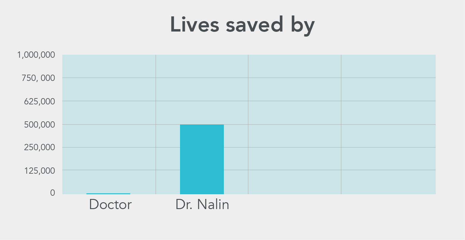 If Dr Nalin had not been around, someone else would probably have discovered this treatment eventually. However, even if we imagine that he sped up the roll-out by only five months, his work alone would have saved about 500,000 lives. This is a very approximate estimate, but it makes his impact more than 100,000 times greater than that of an ordinary doctor:
