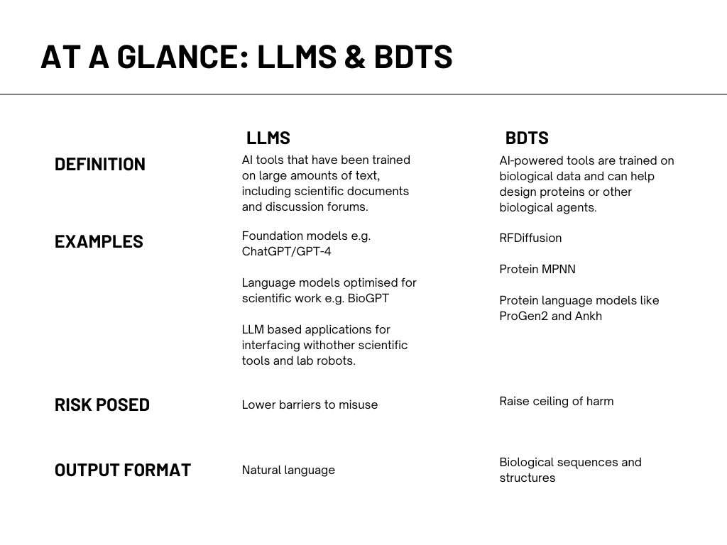 LLMs are AI tools that have been trained on large amounts of data, including scientific information. Examples include foundation models such as ChatGPT/GPT-4, language models optimised for scientific work such as BioGPT, and LLM-based applications that have interfaces with other scientific tools and lab robots. These models can, for example, reduce the human expertise required to carry out gain-of-function research in virology or synthesise biological pathogens. With varying levels of accuracy, they can also predict protein-protein interactions and help design DNA sequences for biological tasks and biological experiments.