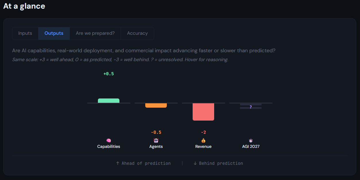 1. "At a glance" gives a visual summary across five tabs: how fast inputs are arriving vs his predictions, how outputs/capabilities compare, how the US/China competition is playing out, whether we're prepared, and overall prediction accuracy scores.