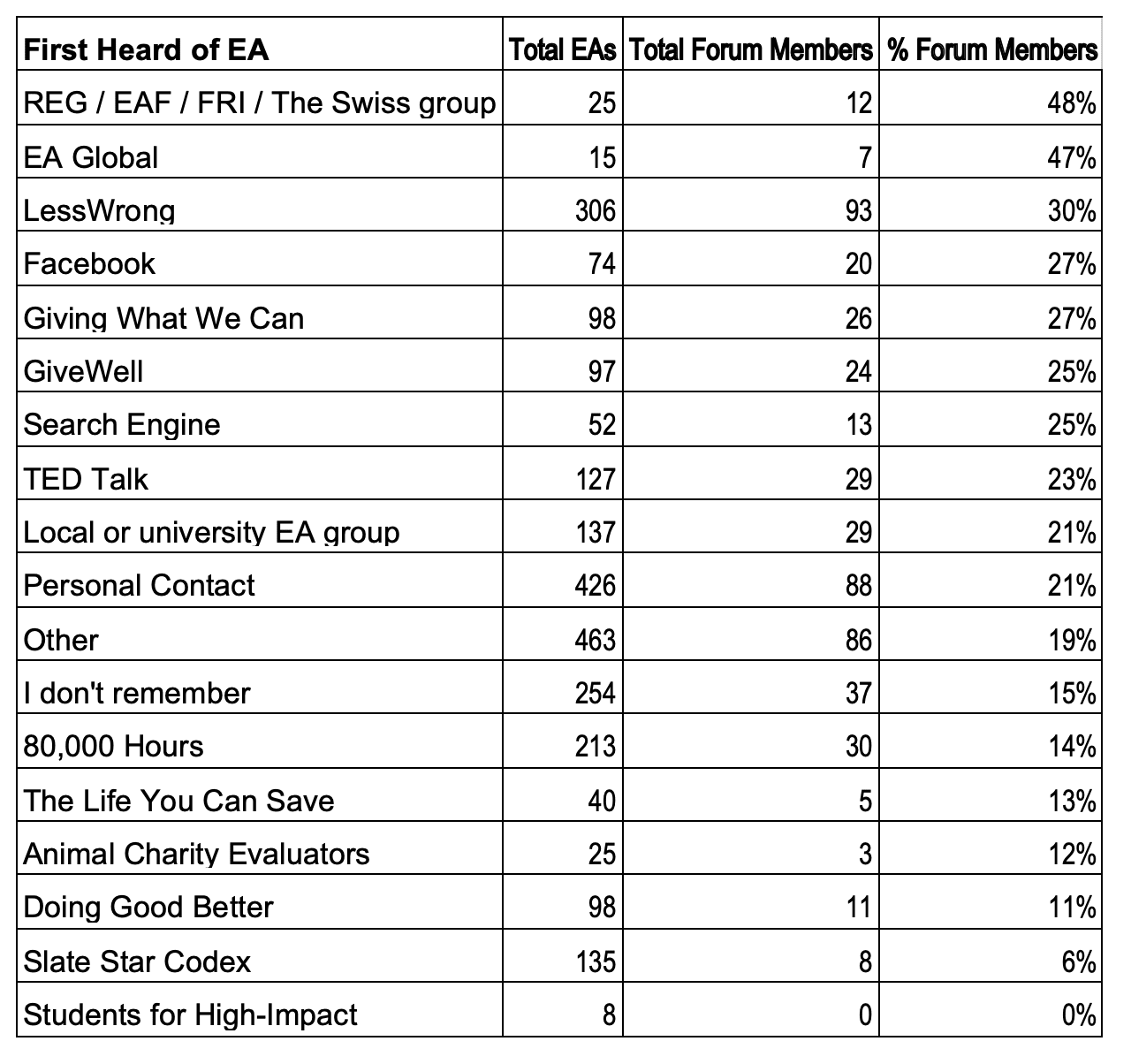 For the most part, the raw percentage point differences between the other categories are quite small (though they may reflect large differences in the proportion of people from different sources who join the Forum as shown in the table below) as are the total numbers of EAs (and Forum members) coming from many of these different sources.