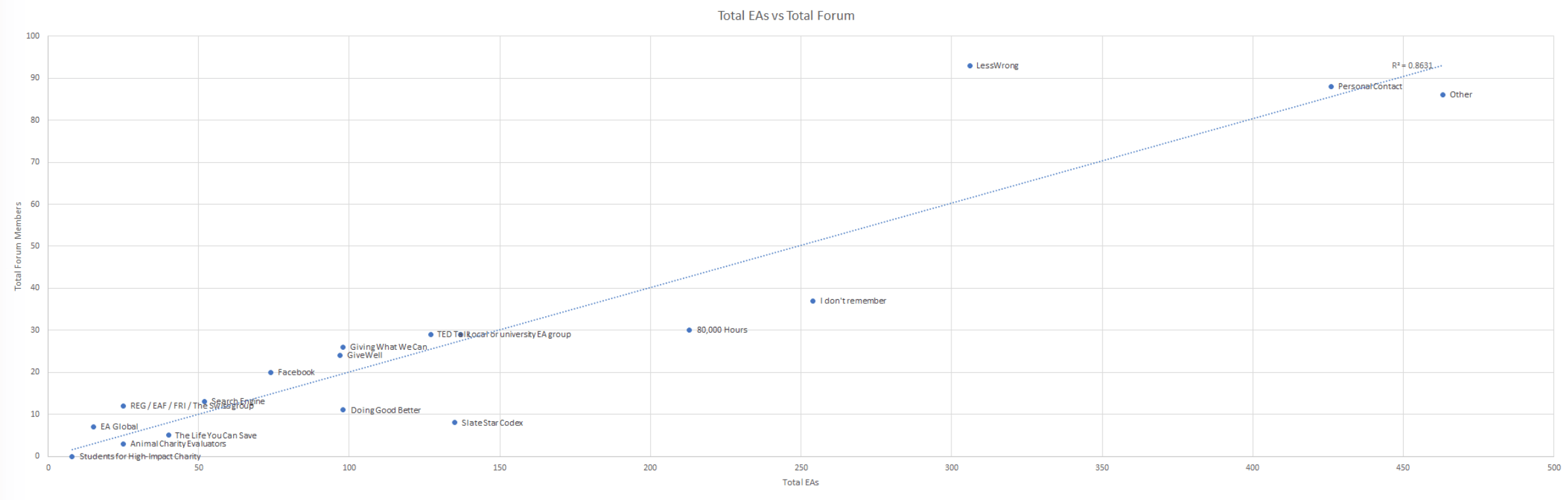 Moreover, when we examine the correlation between the number of EAs, in total, recruited from different sources and the number of Forum users recruited from each source, we find this to be very highly correlated (r=.929), suggesting much of the variance in total Forum users recruited is explained simply by different sources recruiting more total EAs. One can see in the scatter plot below the small number of sources which are above or below the line, suggesting a disproportionately high or low number of Forum members recruited relative to total EAs recruited.