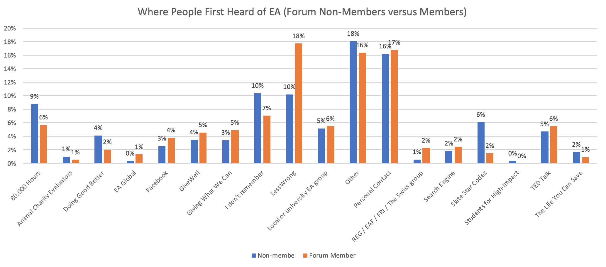 While we present a breakdown of where EA Forum members (compared to non-members) first hear about EA below, we think these raw figures are likely to be of limited use for discerning which routes tend to lead to a higher proportion of more involved members.