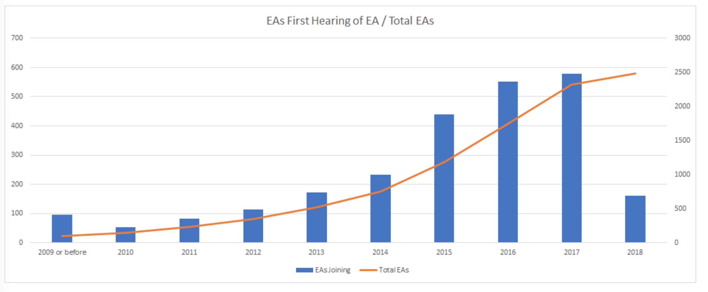 In this post we examine two potential proxies, which may potentially each capture two distinct modes of EA involvement.