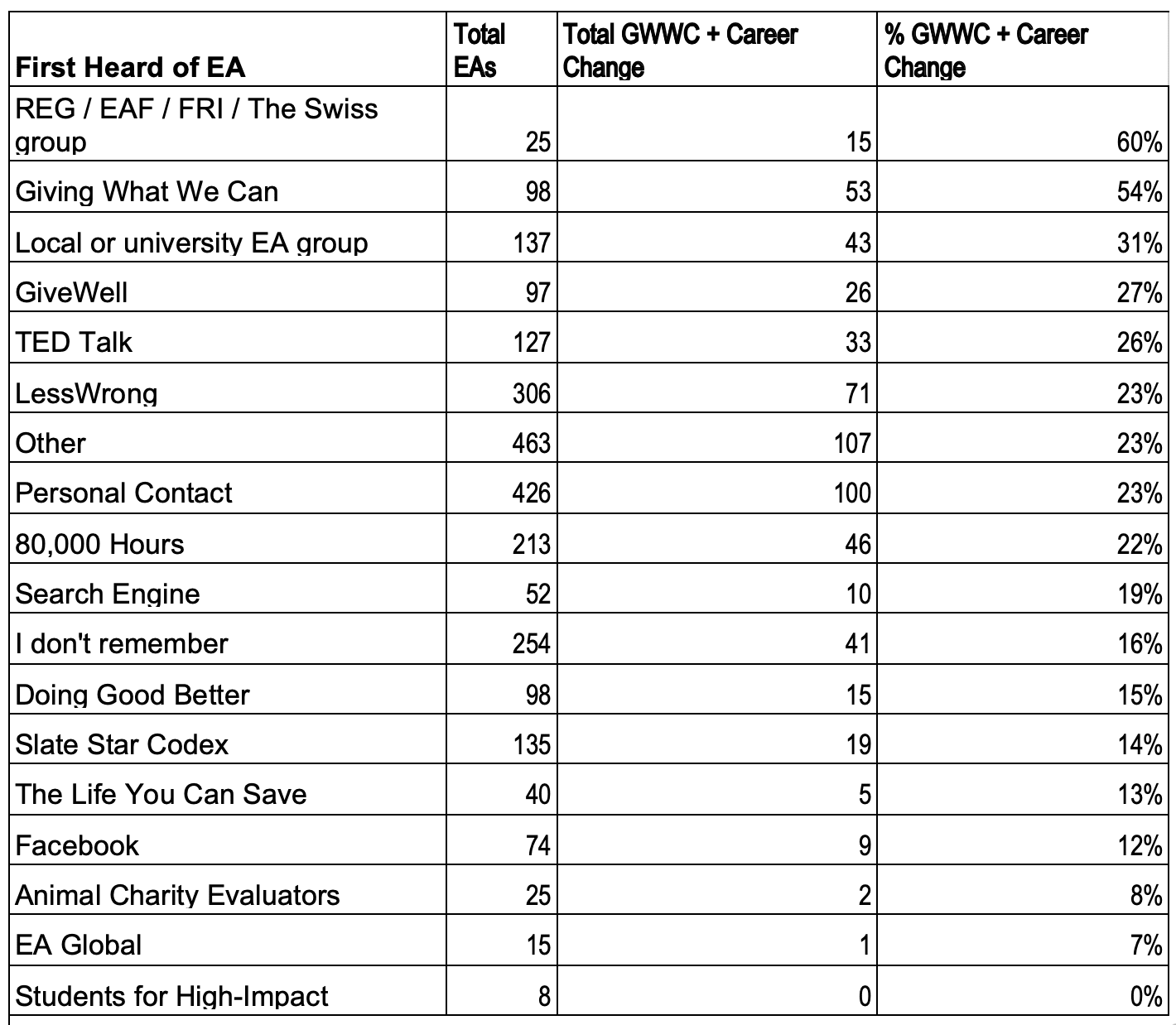 This is largely due to possible confounders, the most obvious of which is when an individual first heard of EA. As noted in our previous post, where EAs first hear about EA has changed dramatically over time. For example, a full 25% of EAs hearing about EA in the last year, report hearing about EA from 80,000 Hours, compared to less than 5% in earlier years.