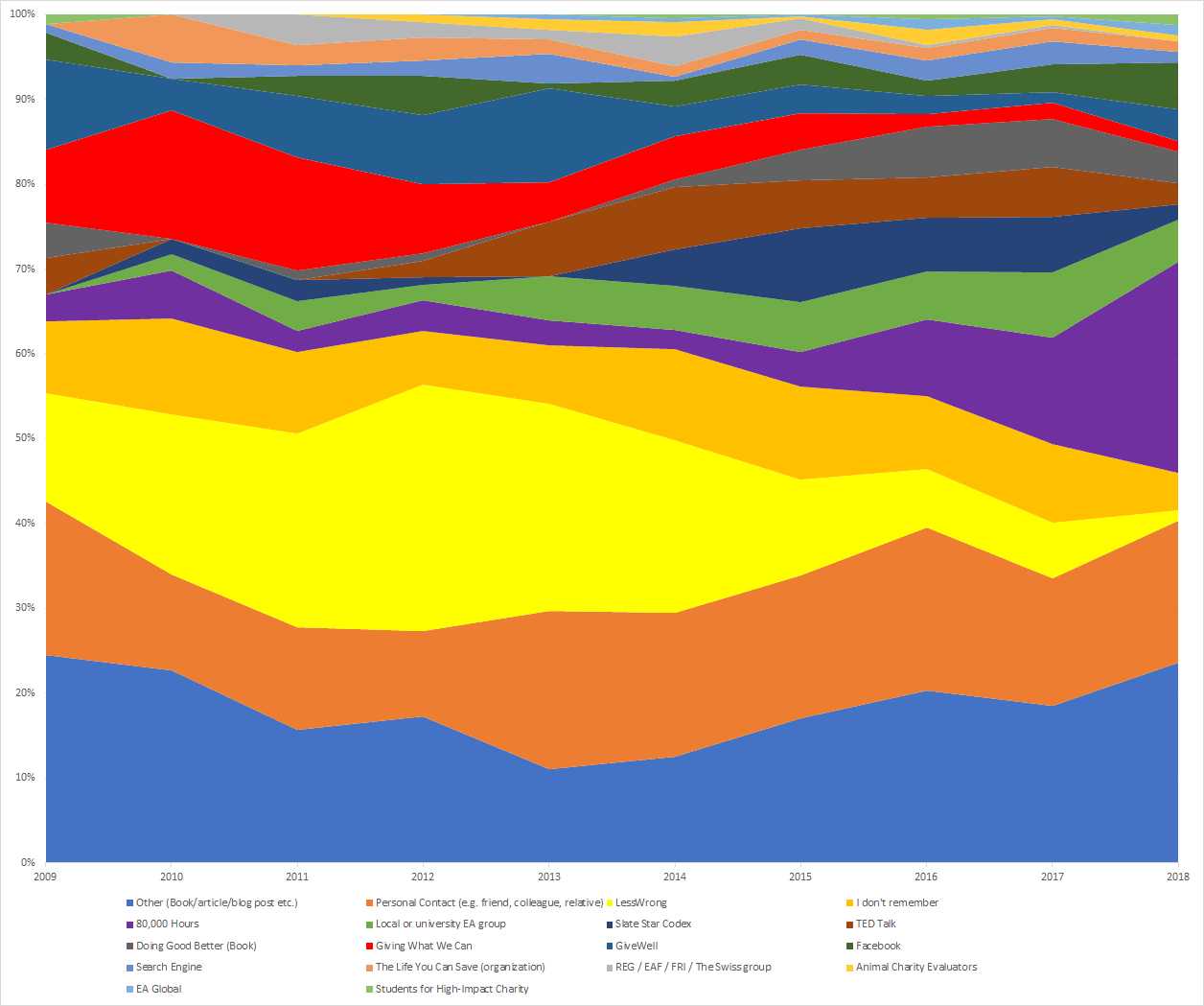 This means that comparing the percentages of more involved EAs who first heard EA from different sources will likely be misleading, due to penalising routes which have disproportionately recruited EAs more recently. That said, it may still serve as an indicator of the effect of different groups’ recruitment on the composition of EA so far.