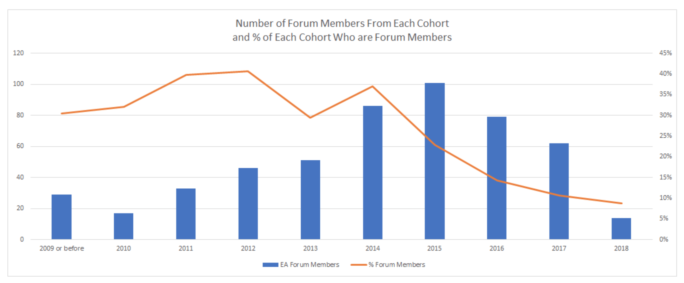 As we know that respondents who more recently heard of EA are much less likely to be more involved in EA (as captured by metrics such as EA Forum membership- see graph below), this means that we would expect those who heard of EA from 80,000 Hours to contain many more new and less involved EAs.