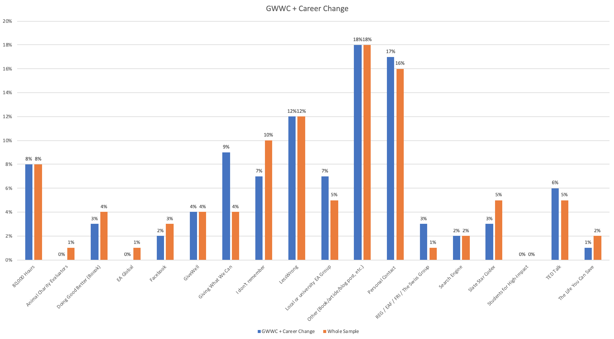 As with total number of Forum members, the total numbers of EAs taking the GWWC Pledge (r=0.970 (p<0.01)), making (or expecting) a career change (r=0.9888 (p<0.01)) or both (r=0.9501 (p<0.01), were highly correlated with the total numbers of EAs being recruited from each source.
