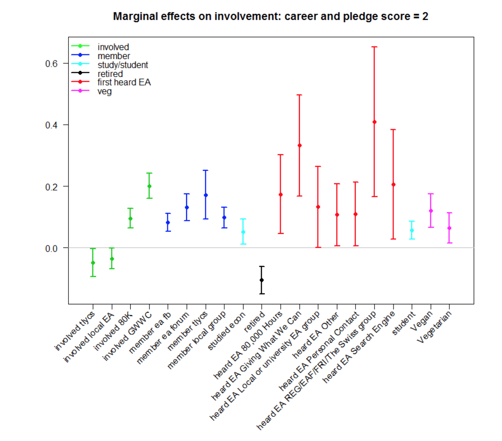Studying economics specifically seemed to be a positive predictor of having both taken the GWWC pledge and made a career change. Notably, being a vegetarian and vegan (especially a vegan) were both significantly positively associated with having both taken the GWWC pledge and made a career change.