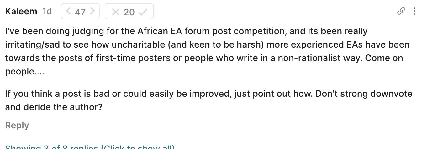 In my experience the forum is too harsh on posts that contain minor grammatical errors or deviate from the typical EA tone, characterized by dispassionate, clinical language, and the use of rationalist in-group jargon.