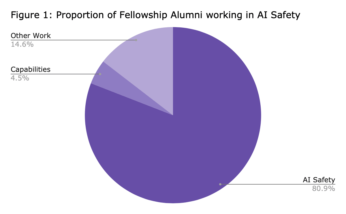 - That 80% of fellowship alumni are now working in AI Safety. This put the average fellowship in line with MATS in terms of retention rate, which is very encouraging.