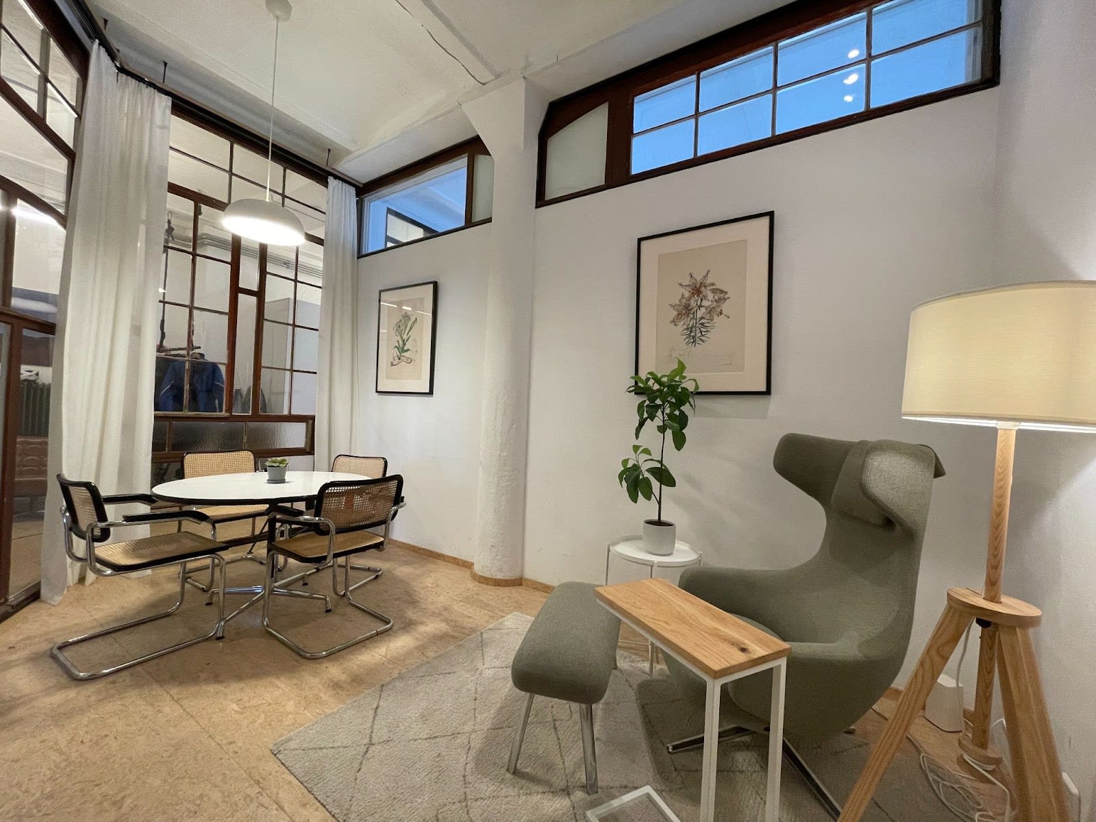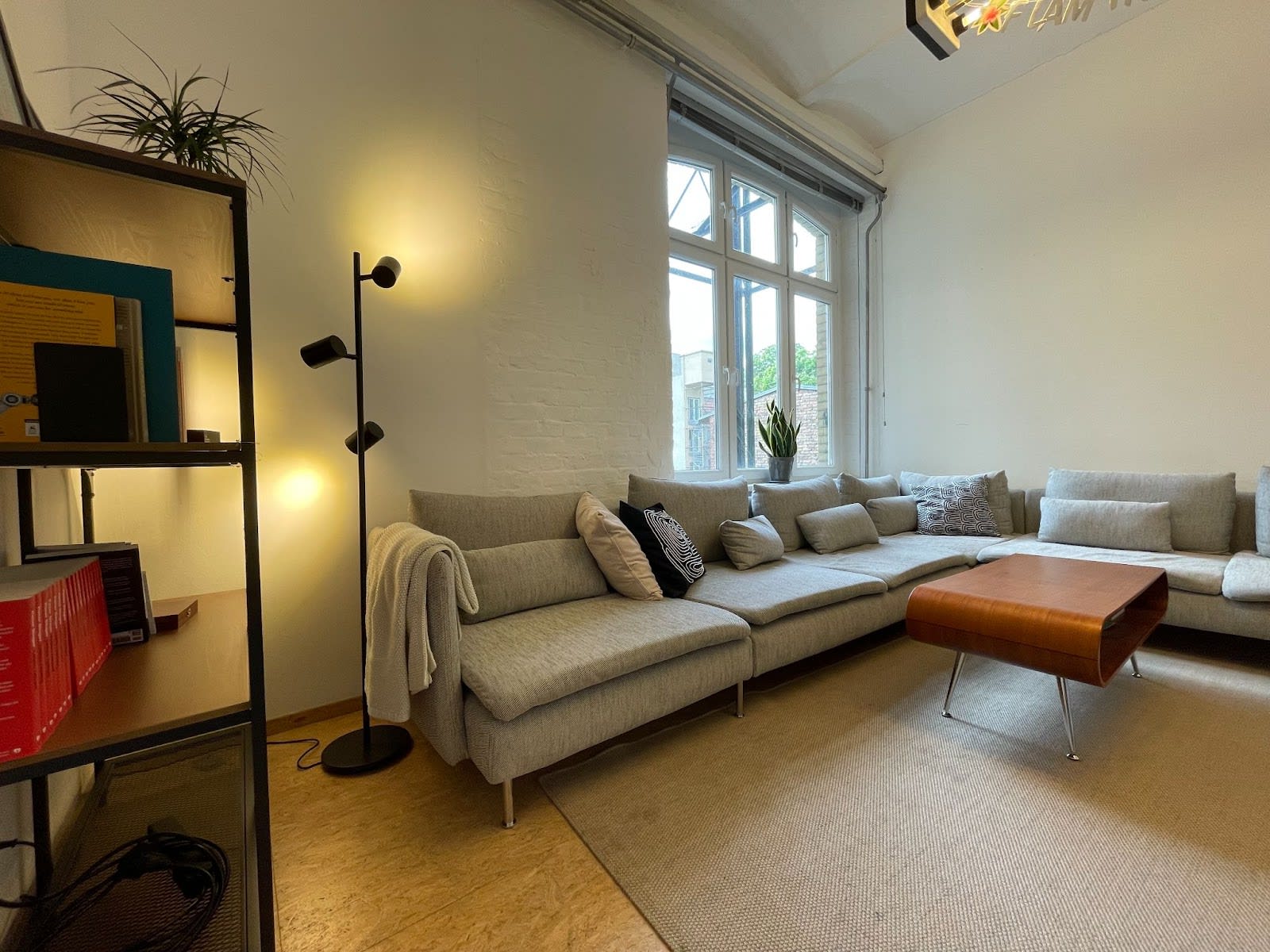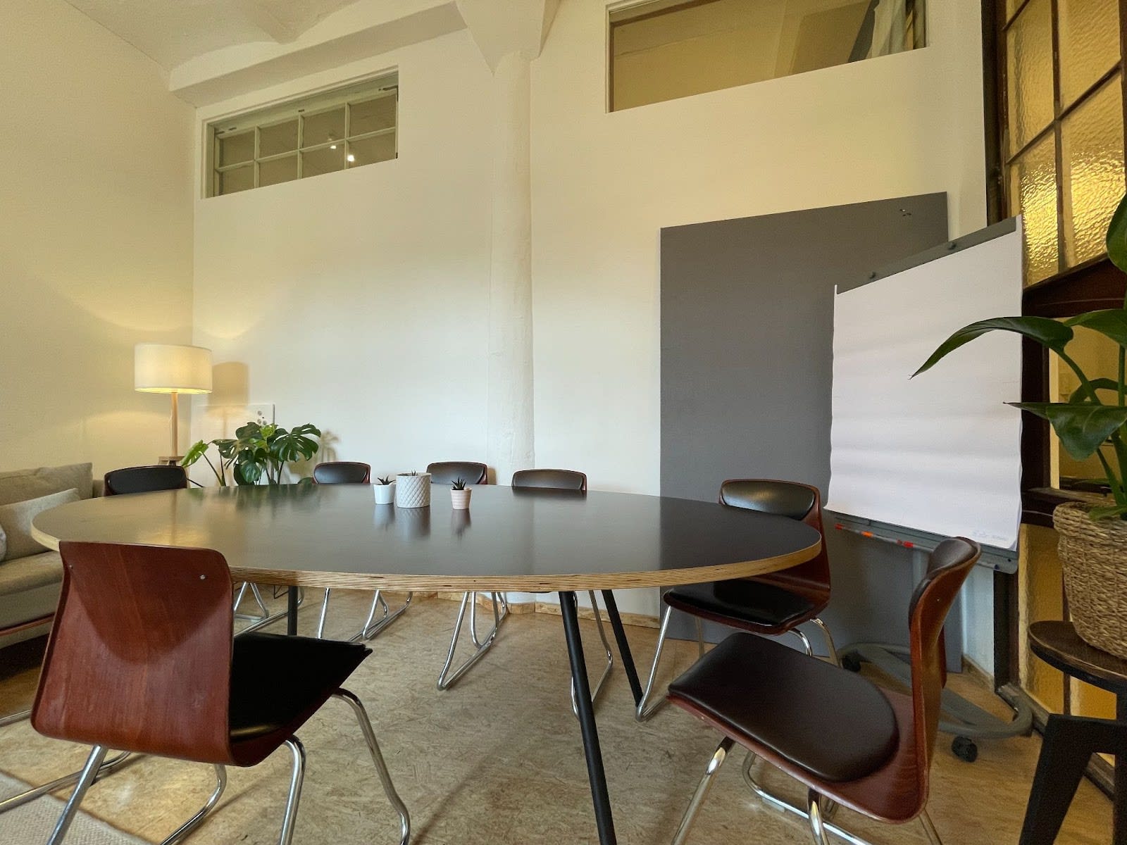 - Workshop Room: "Flamingo Paradise" serves as a workshop room with a big sofa, a large desk, a flip chart, and a pin board. It can also be used as a small event space, complete with a portable projector. When not in use for events, it functions as a chill and social area.