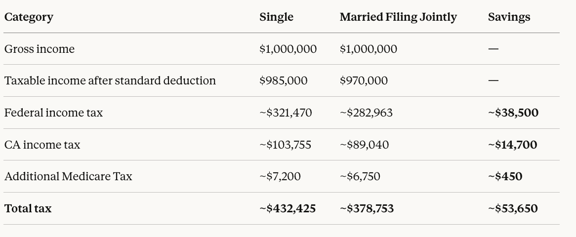 By marrying EAs in different tax brackets, Highly Engaged EAs reduces average tax burden through joint filing to enable greater giving. A Californian AI safety researcher with a million dollar salary could give an extra $53k/year by tying the knot with an unpaid grad student!