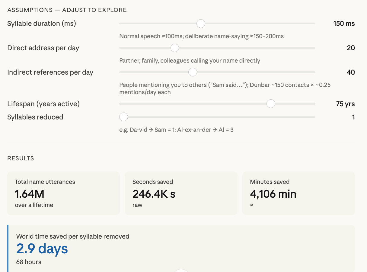- Brevity. Claude BOTECs that each additional syllable to a person’s name adds 68 hours to global pronunciation costs. Given that this will disproportionately be time spent by EAs, one-syllable names are a slam dunk.