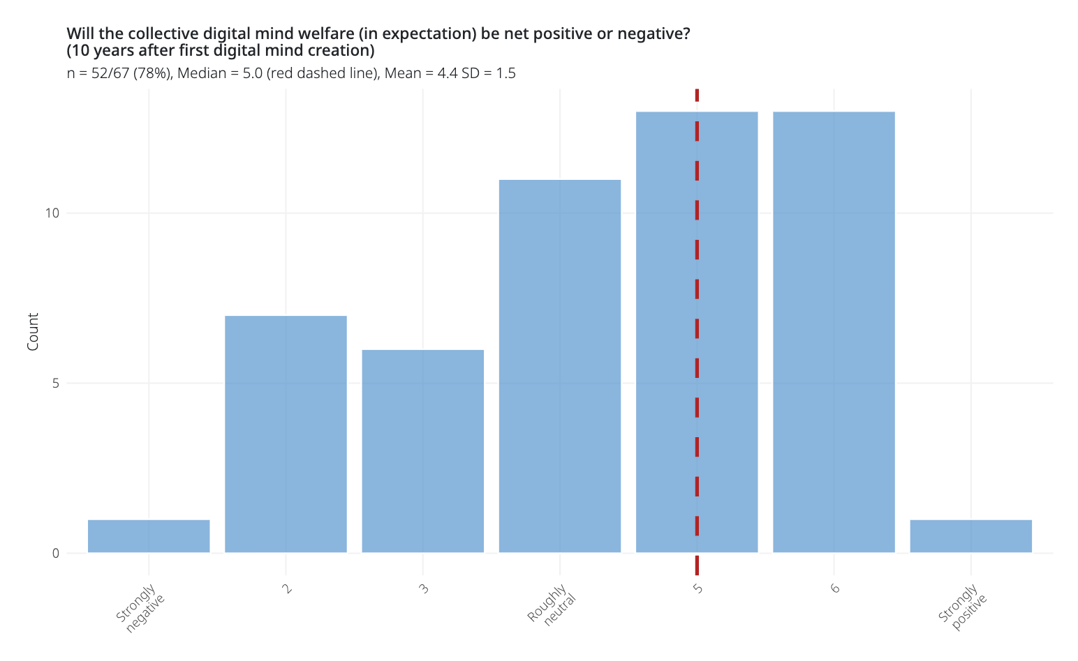 In the best case, digital minds would simply be designed to flourish. We might be able to design them to be happy. Furthermore, in contrast to biological beings, they may be able to self-modify and adjust their own experiences at will. But it’s far from obvious this is how things will go, and the answer likely differs between near-term AI systems and long-term digital minds at scale. In the survey conducted with Brad, experts were uncertain and divided on whether digital minds would, by default, have negative, neutral, or positive welfare states. Some pointed out that digital minds could end up in negative states because they are optimized for efficiency rather than welfare, and lack protections. It’s possible that the optimistic scenarios require deliberate effort, while negative outcomes could happen without it, but I am quite unsure about this. The answer may also vary significantly across different types of digital minds, especially depending on their capabilities and degree of agency.