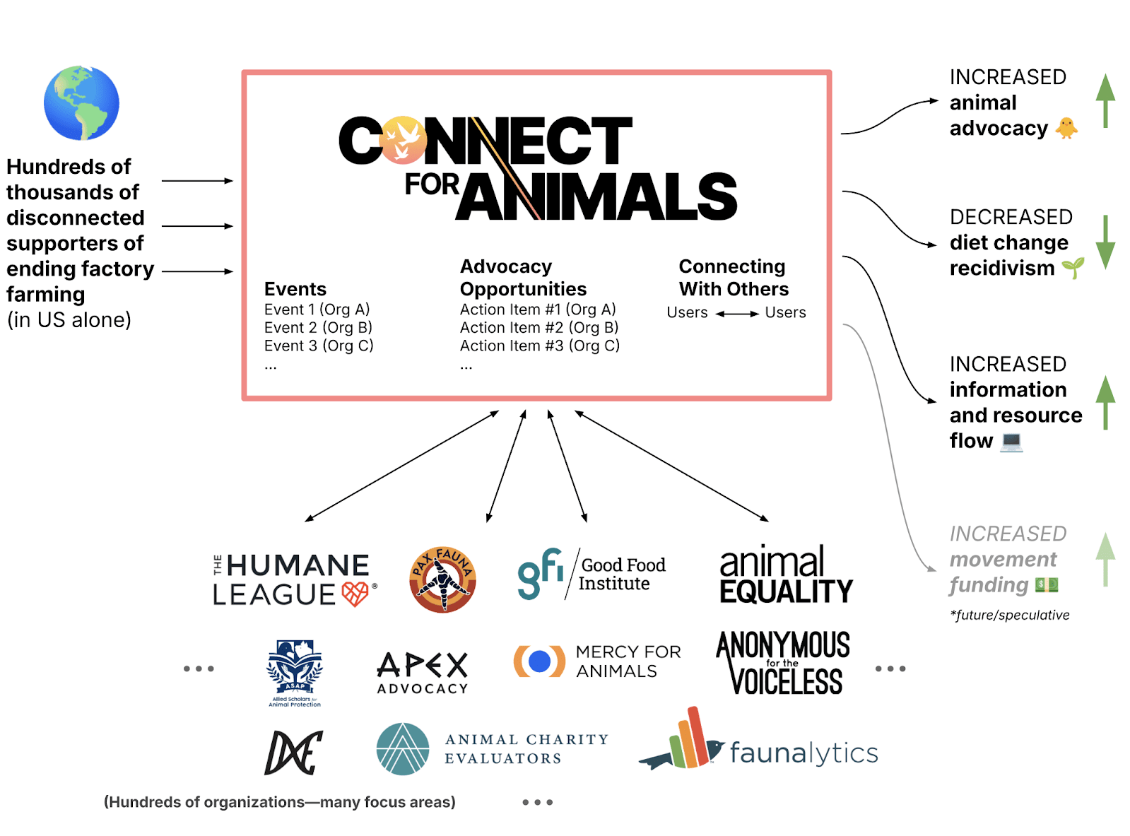 - Increased information and resource flow: Making it easier for pro-animal people to discover opportunities, organizations, and actions.